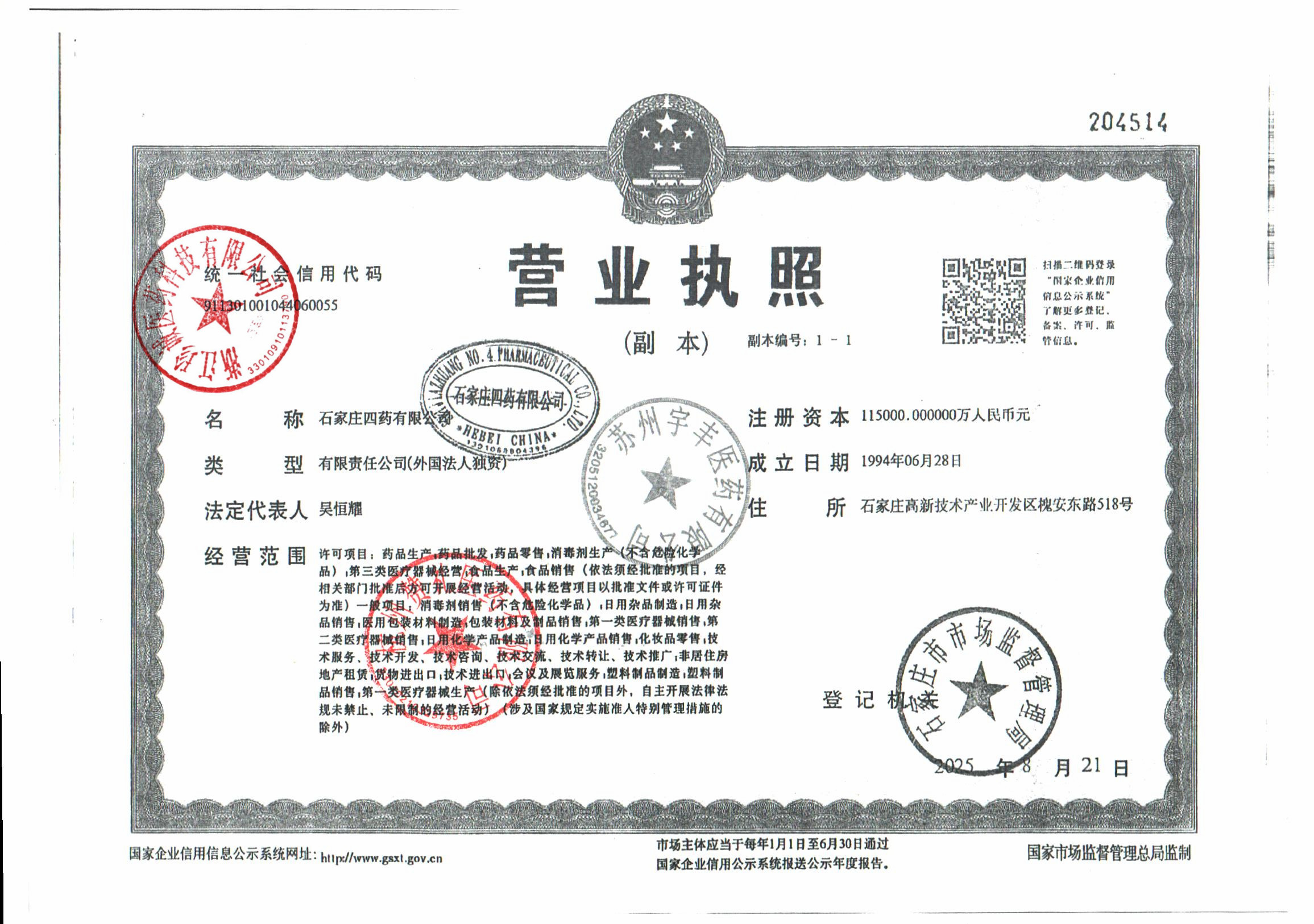 | 1 | 1300003 | 石家庄四药有限公司 | 营业执照.jpg | Apr 21, 2026 2:39:08 PM | 查看下载 | |