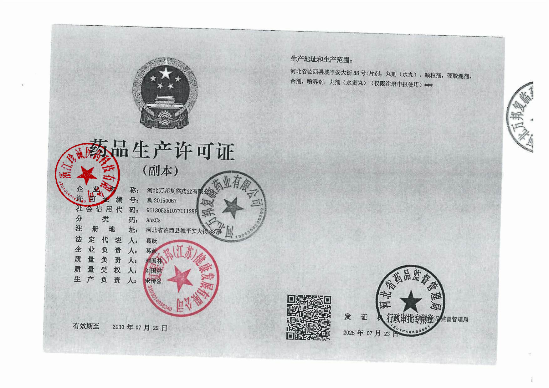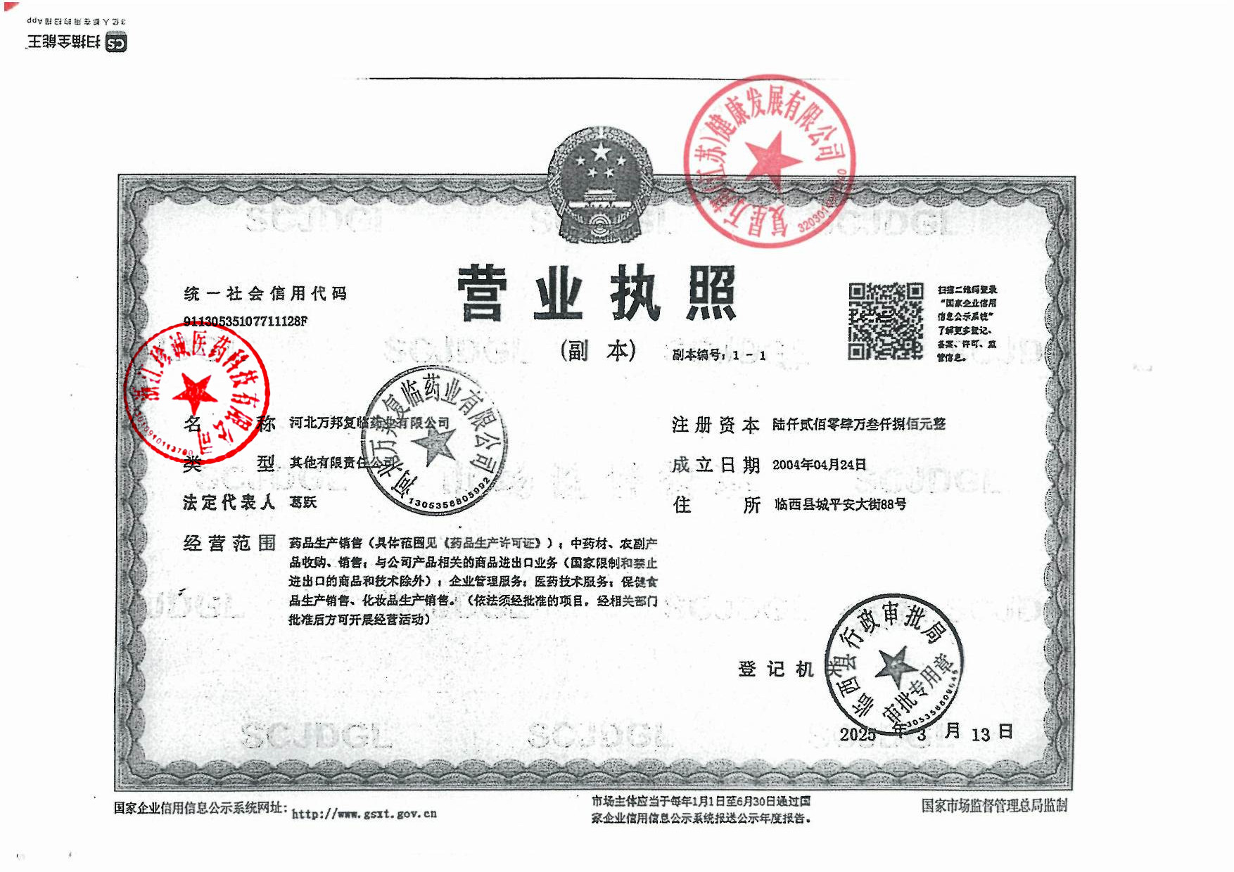 1 | 13000165 | 河北万邦复临药业有限公司 | 生产许可证 (3).jpg | Sep 23, 2025 3:23:34 PM | 查看下载 | |