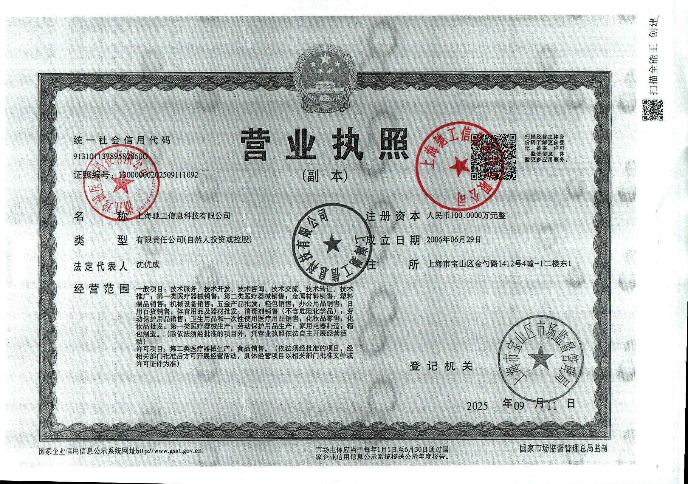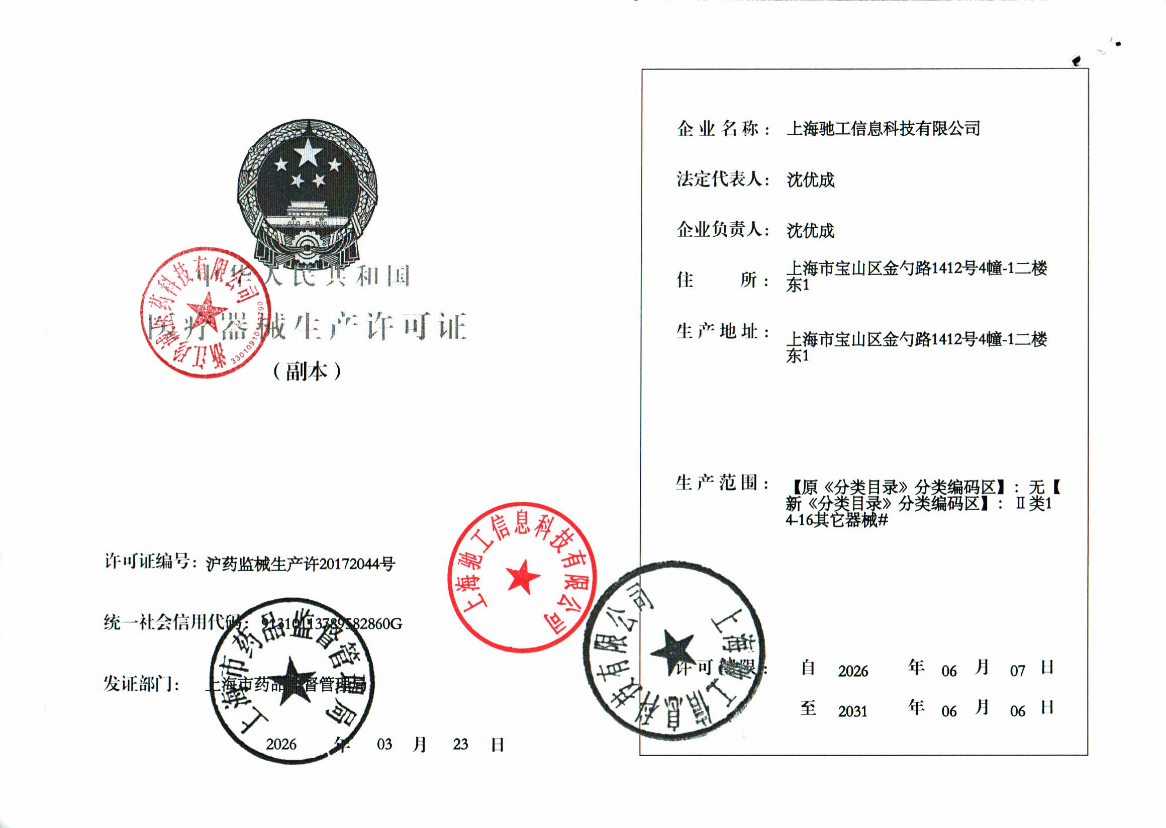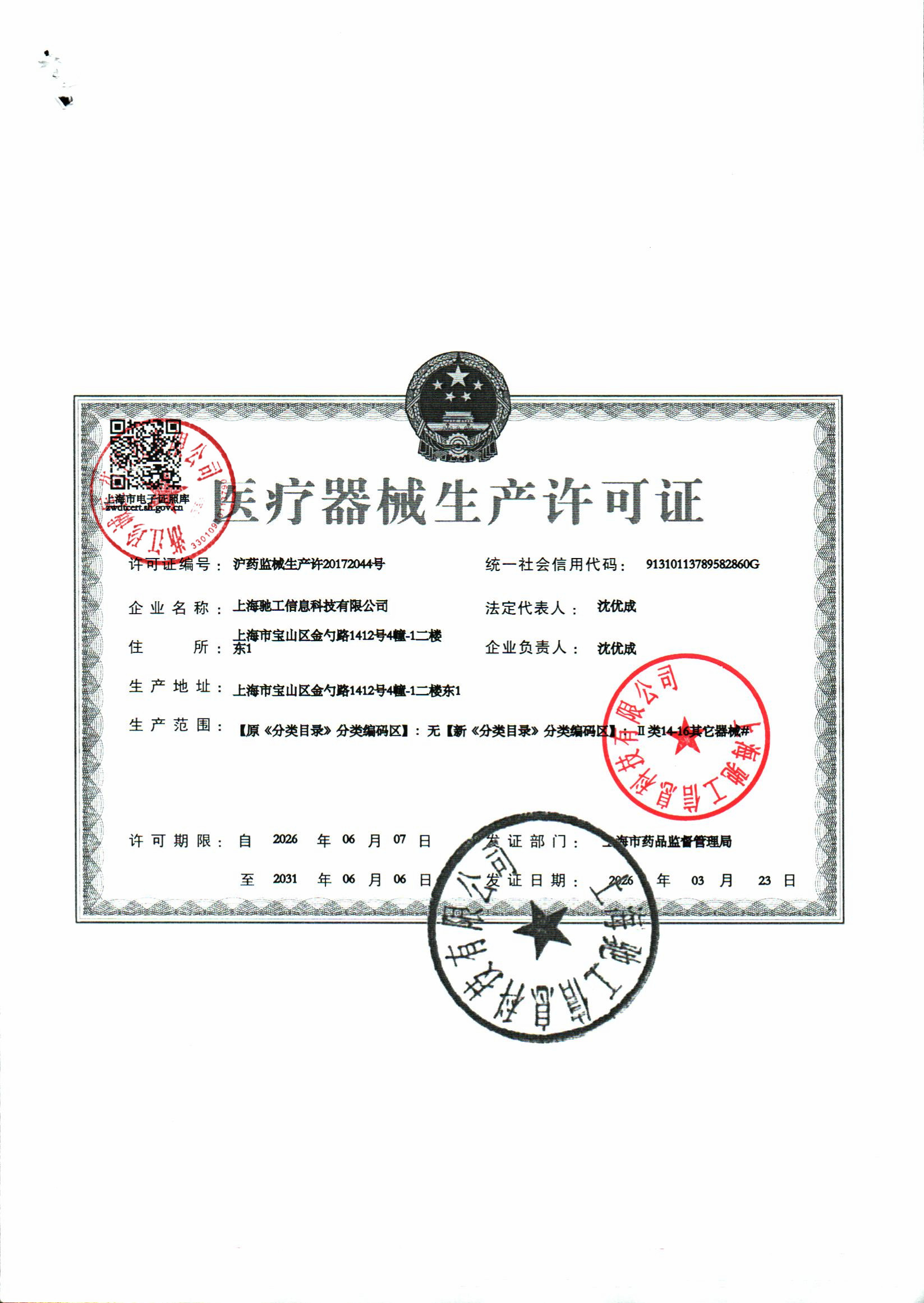 | 6 | 31000057 | 上海驰工信息科技有限公司 | 医疗器械生产许可证副本.jpg | Sep 15, 2023 10:46:39 AM | 查看下载 | |