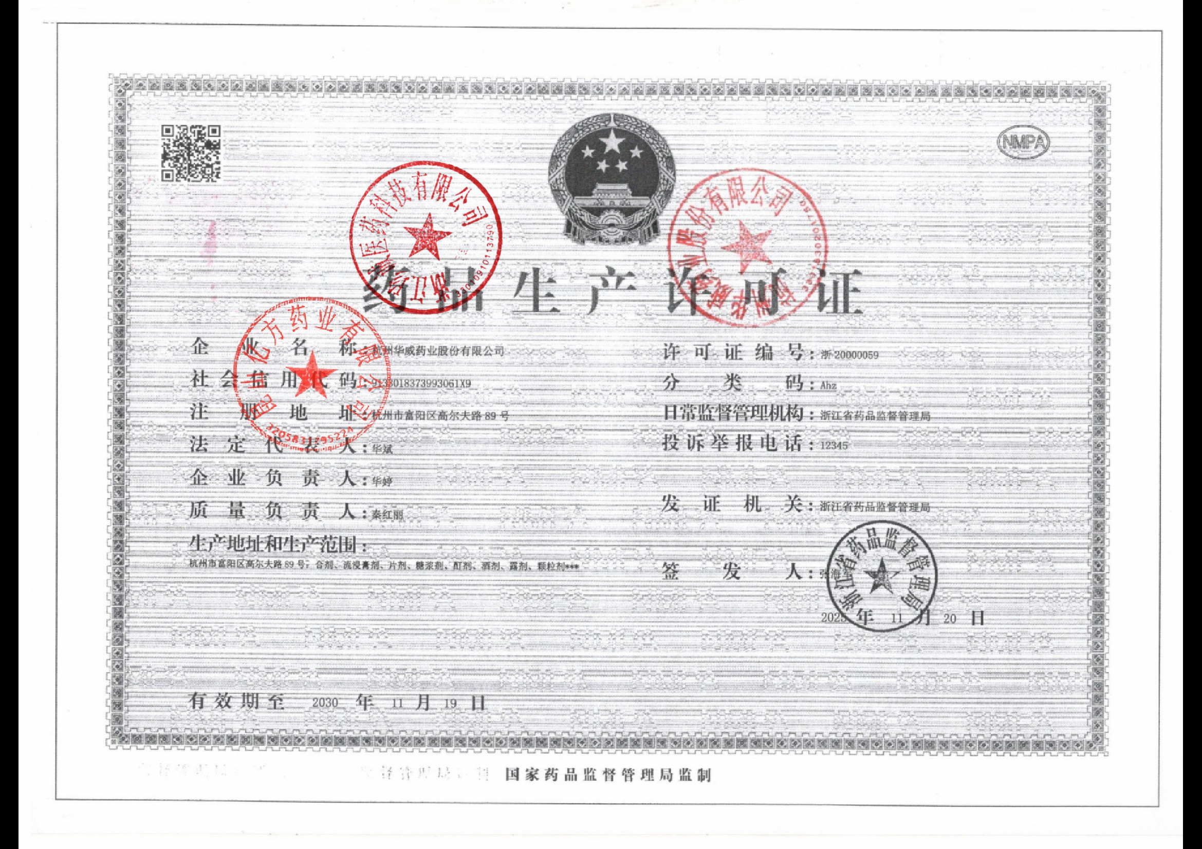 | 1 | 33000140 | 杭州华威药业股份有限公司 | 药品生产许可.jpg | Mar 13, 2026 10:34:48 AM | 查看下载 | |