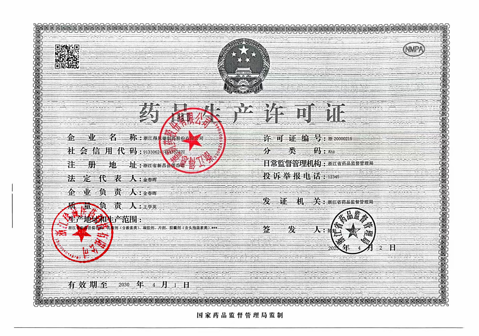 1 33078817 浙江得恩德制药股份有限公司 新药品生产许可证.jpg Sep 15, 2025 1:15:29 PM 查看下载