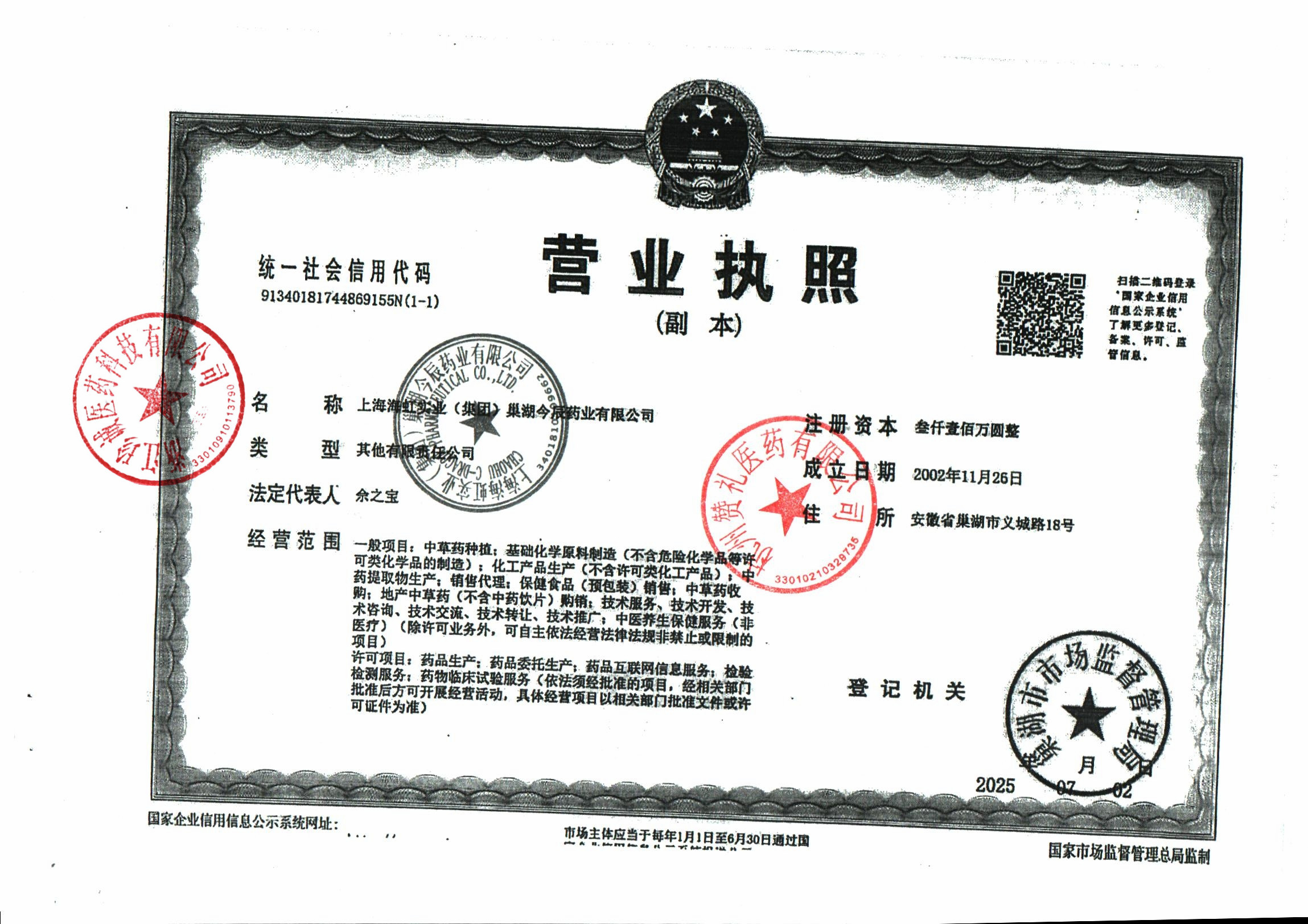 | 2 | 34000054 | 上海海虹实业(集团)巢湖今辰药业有限公司 | 营业执照.jpg | Jan 21, 2026 10:25:13 AM | 查看下载 | |