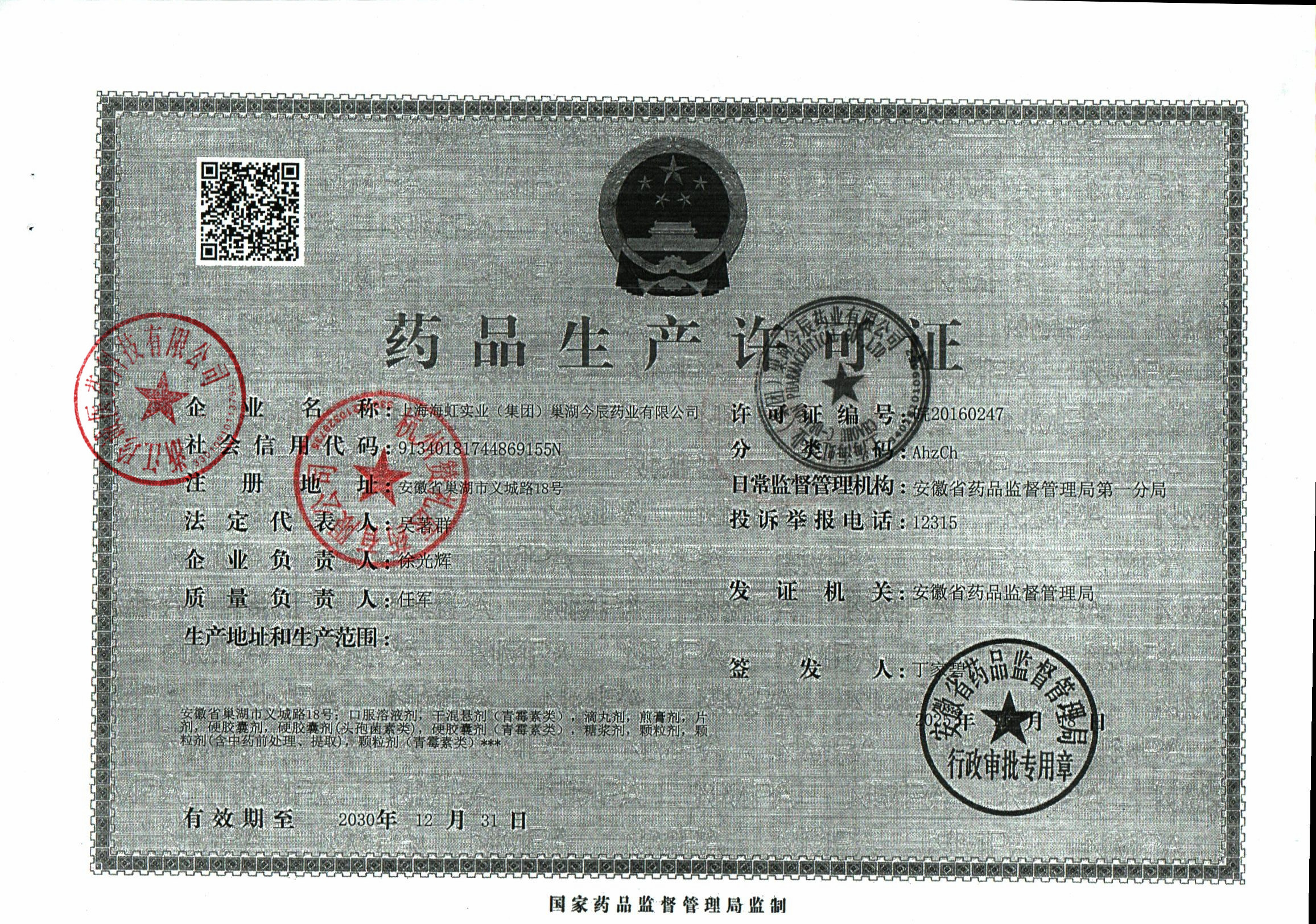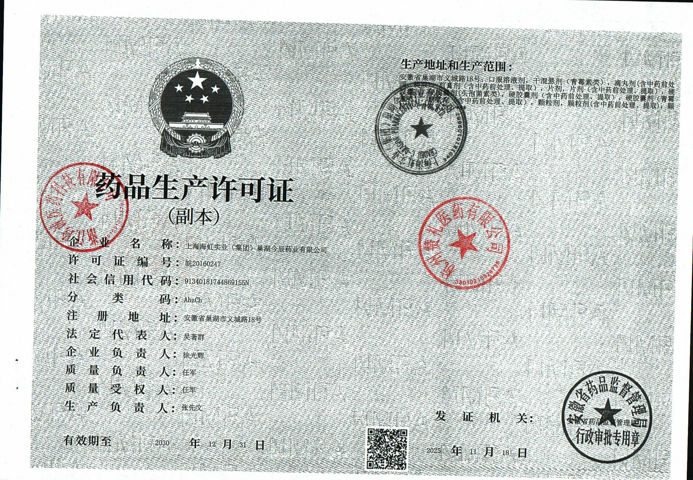 | 4 | 34000054 | 上海海虹实业(集团)巢湖今辰药业有限公司 | 许可证 (1).jpg | Jan 21, 2026 10:25:13 AM | 查看下载 | |