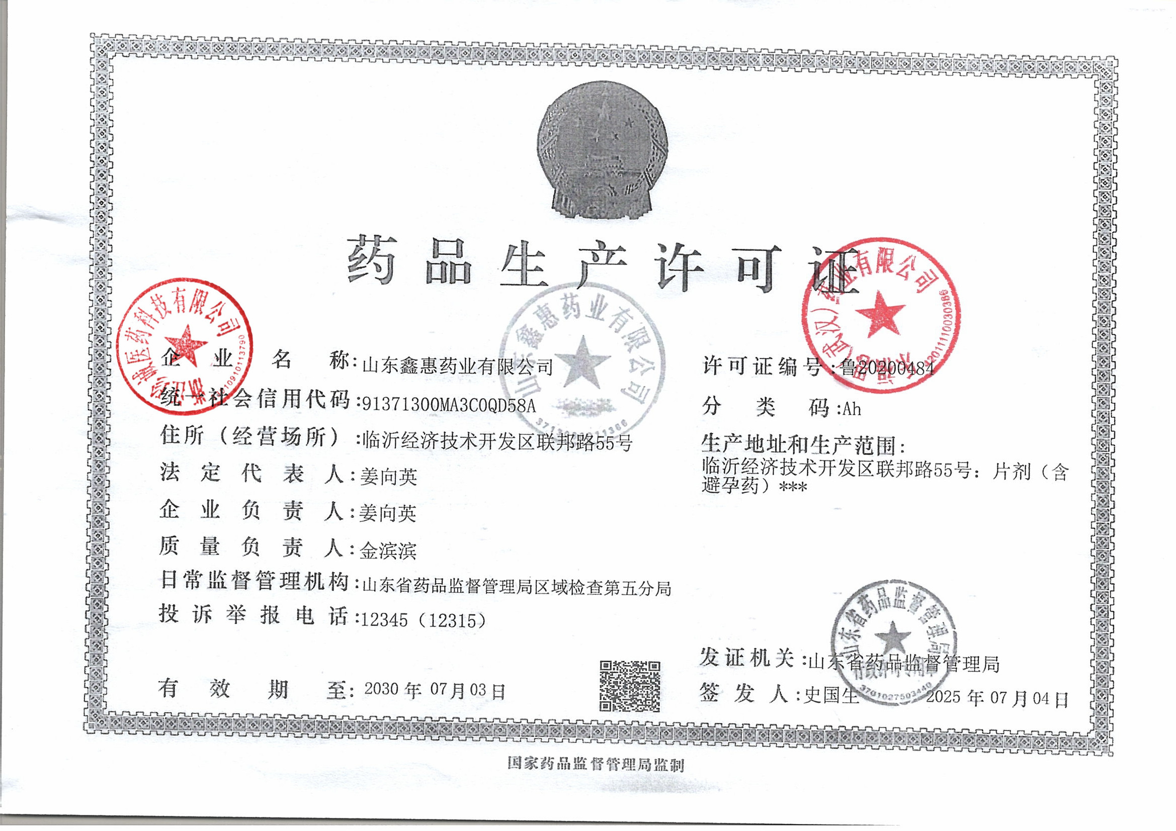 | 3 | 37000129 | 山东鑫惠药业有限公司 | 许可证 (2).jpg | Mar 17, 2026 9:37:03 AM | 查看下载 | |