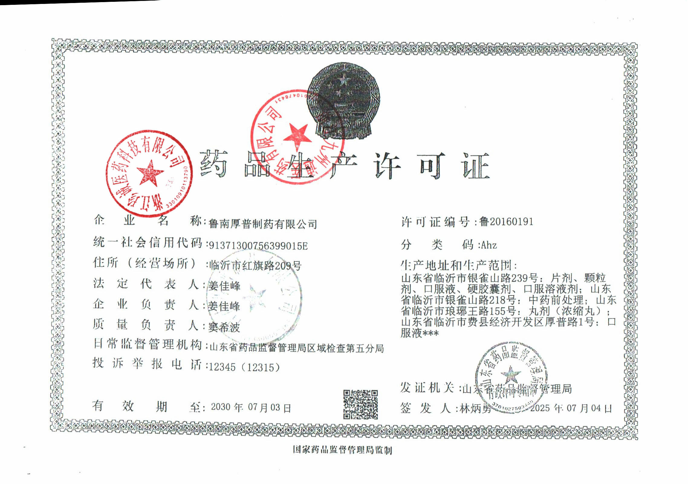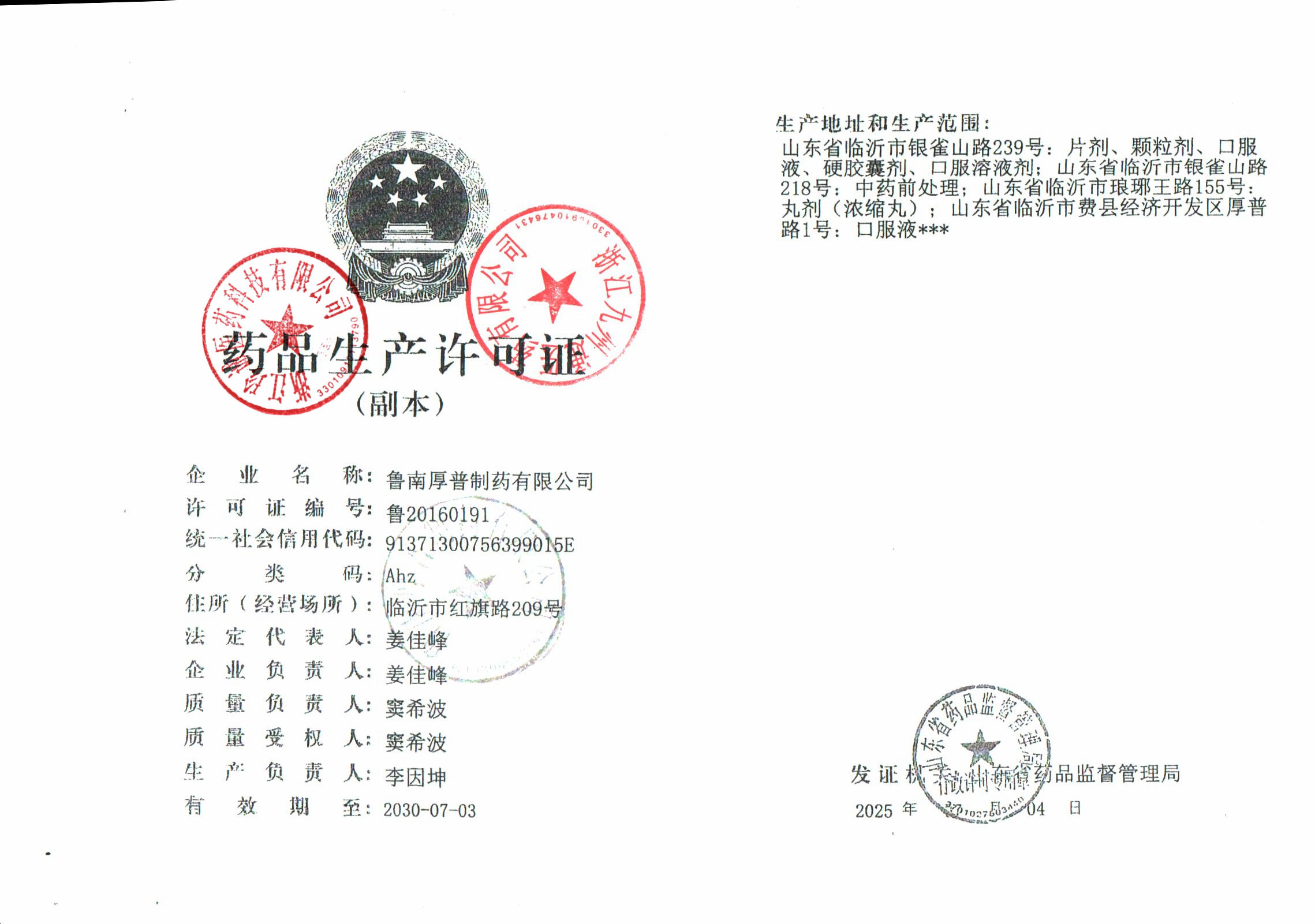 | 1 | 37000807 | 鲁南厚普制药有限公司 | 许可证 (1).jpg | Apr 9, 2026 2:06:27 PM | 查看下载 | |