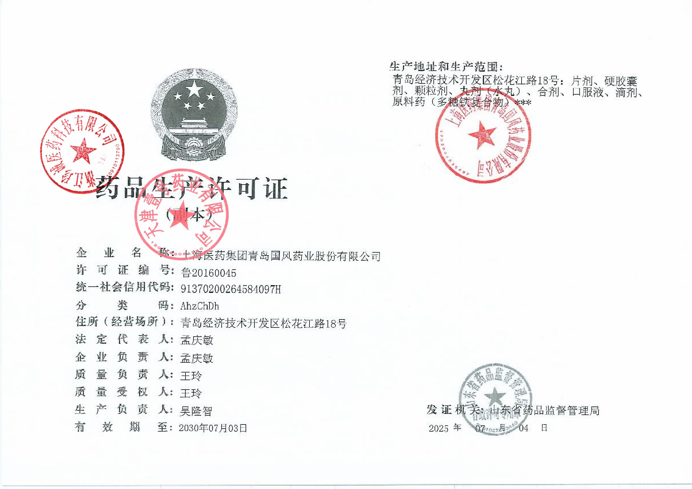 | 5 | 37000813 | 上海医药集团青岛国风药业股份有限公司 | 药品生产许可证 (1).jpg | Dec 18, 2025 1:40:45 PM | 查看下载 | |