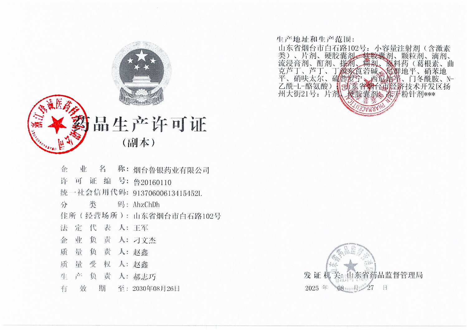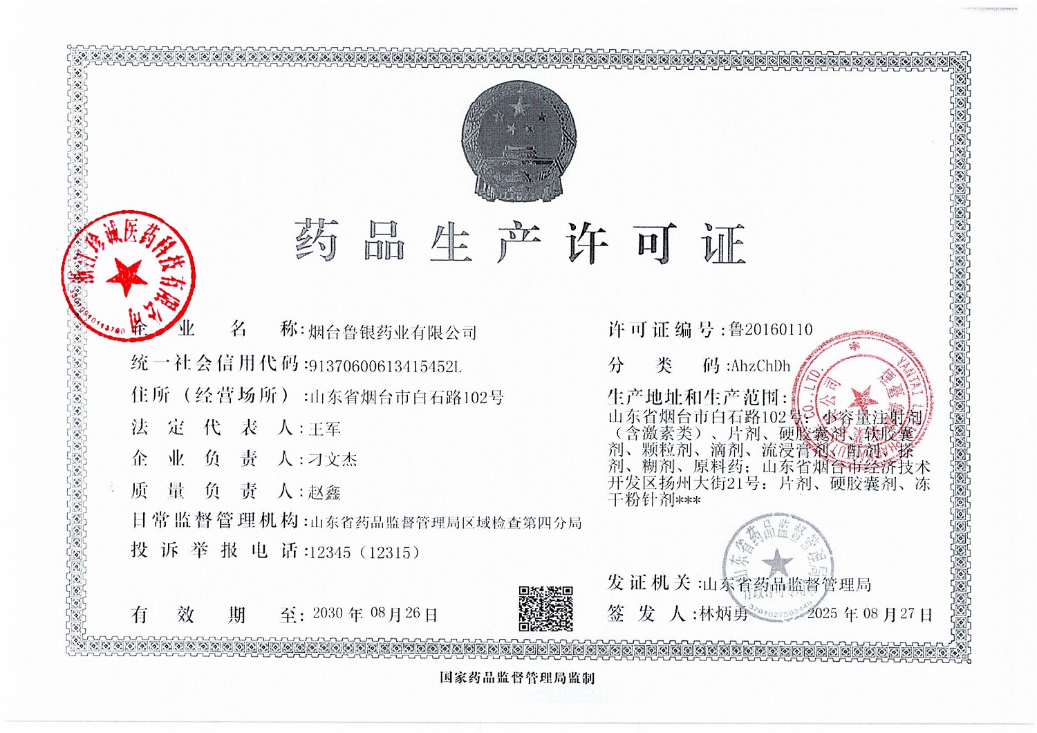 4 | 37000819 | 烟台鲁银药业有限公司 | 药品生产许可证 (1).jpg | Sep 11, 2025 11:01:46 AM | 查看下载 | |
