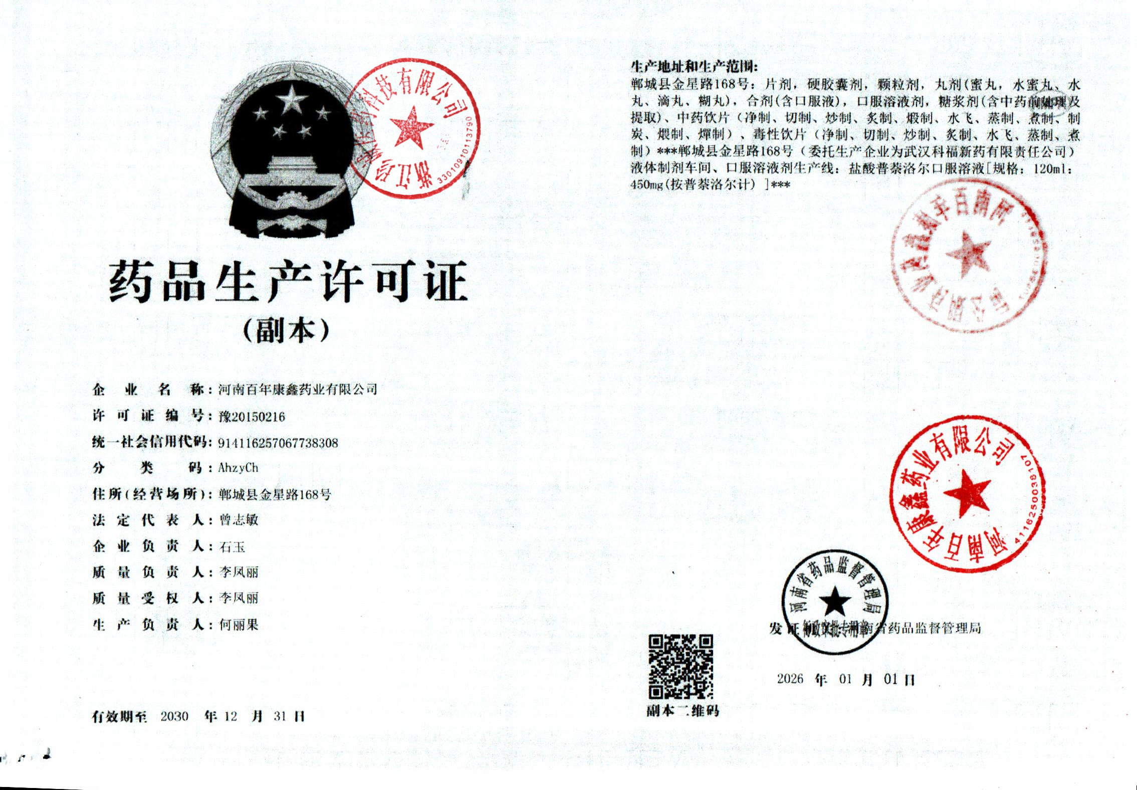 | 2 | 41000087 | 河南百年康鑫药业有限公司 | 许可证 (1).jpg | Jan 5, 2026 9:10:39 AM | 查看下载 | |