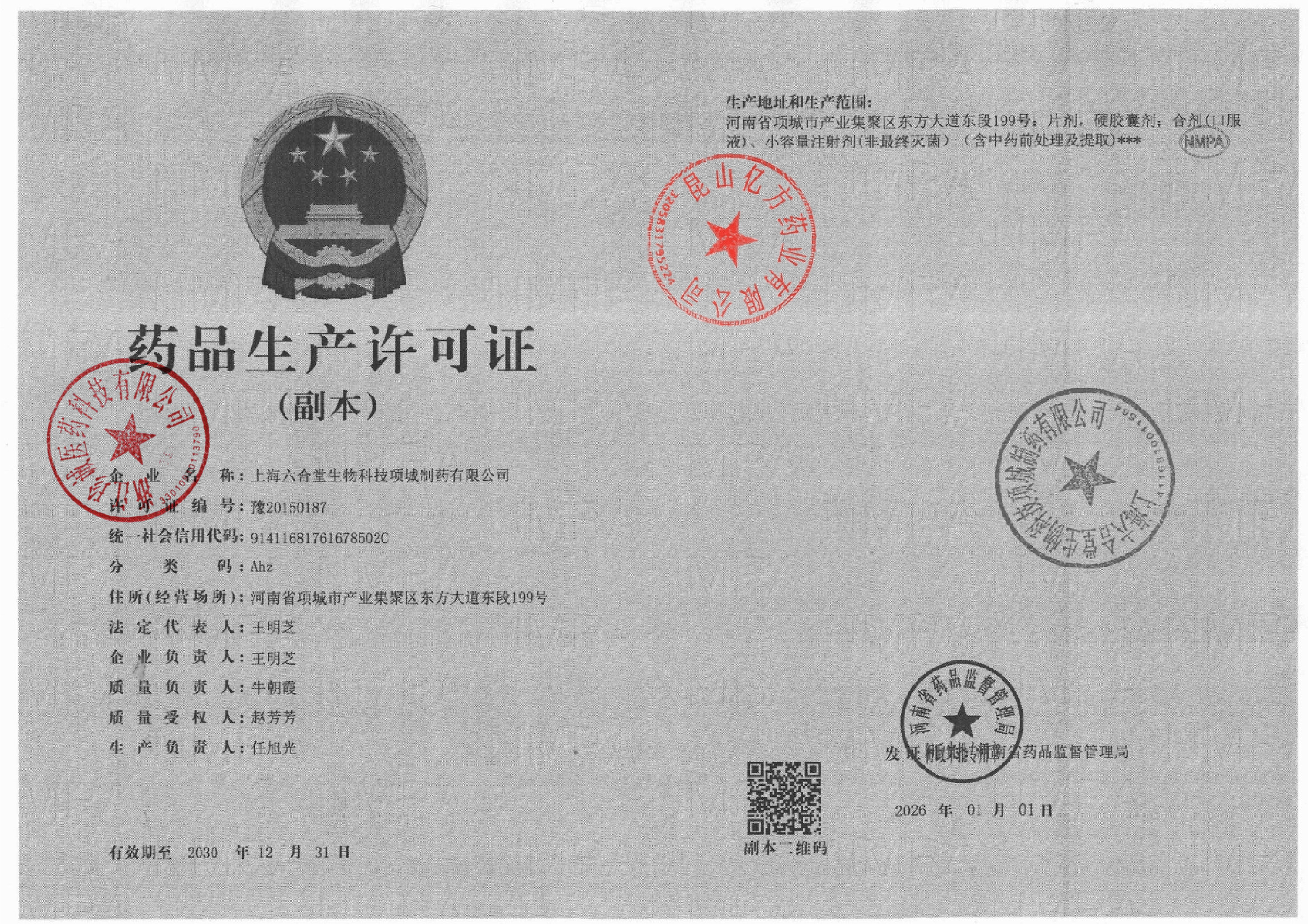 | 1 | 41000135 | 上海六合堂生物科技项城制药有限公司 | 药品生产许可.jpg | Feb 10, 2026 1:44:55 PM | 查看下载 | |