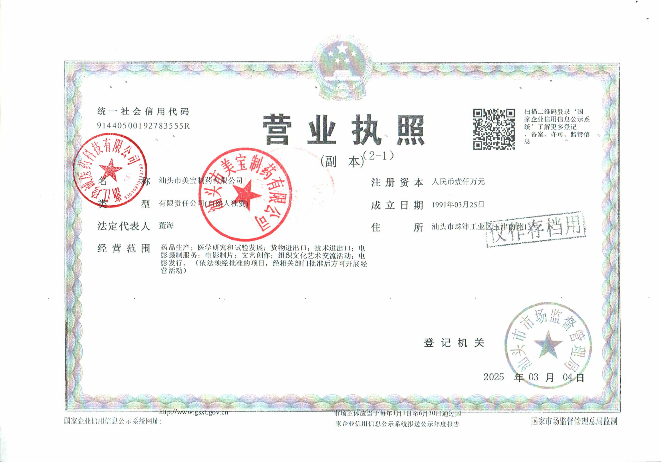 | 1 | 44000486 | 汕头市美宝制药有限公司 | 营业执照.jpg | Oct 24, 2025 2:13:05 PM | 查看下载 | |