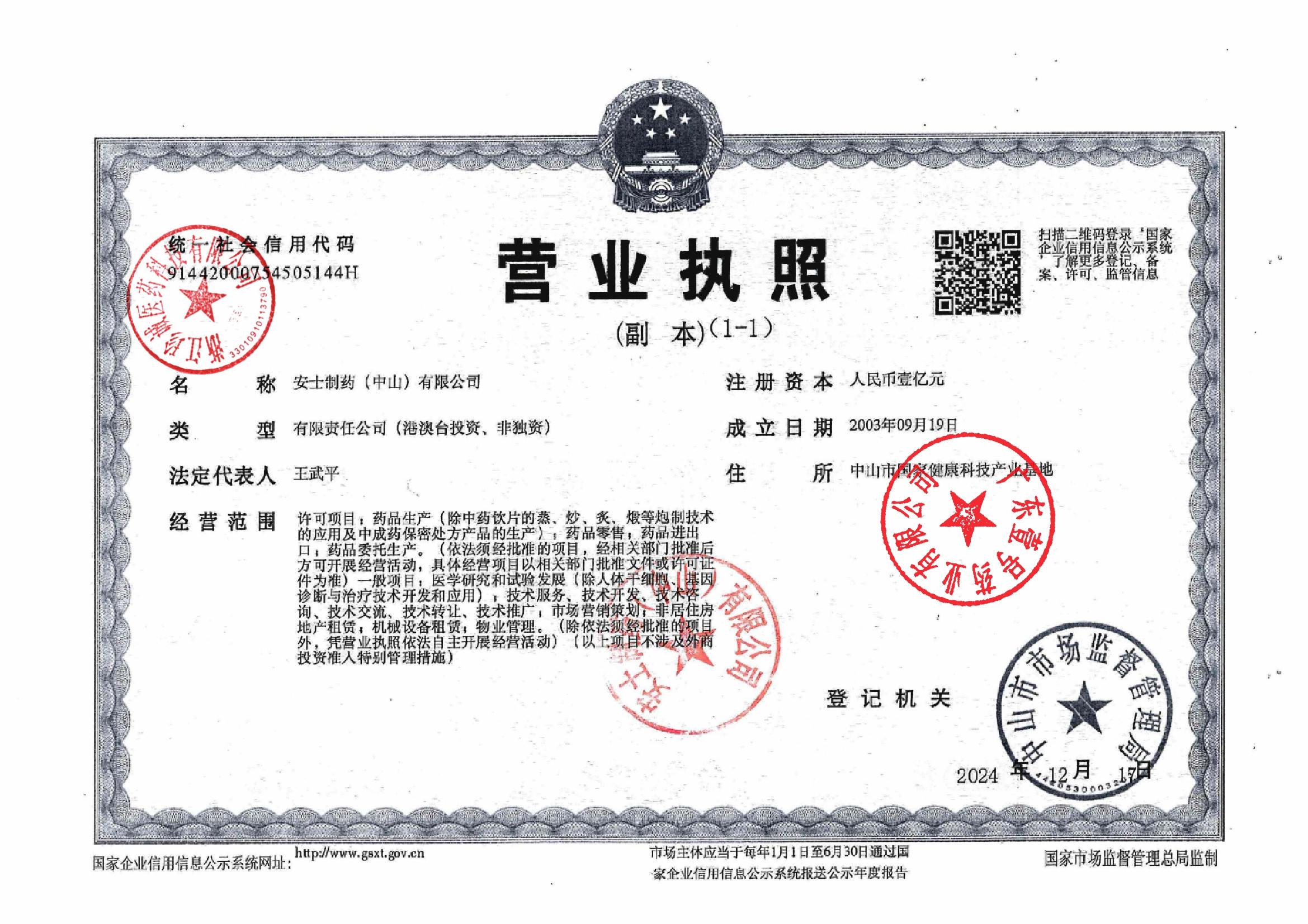 | 4 | 44000522 | 安士制药(中山)有限公司 | 委托生产.jpg | Jun 3, 2024 1:42:58 PM | 查看下载 |