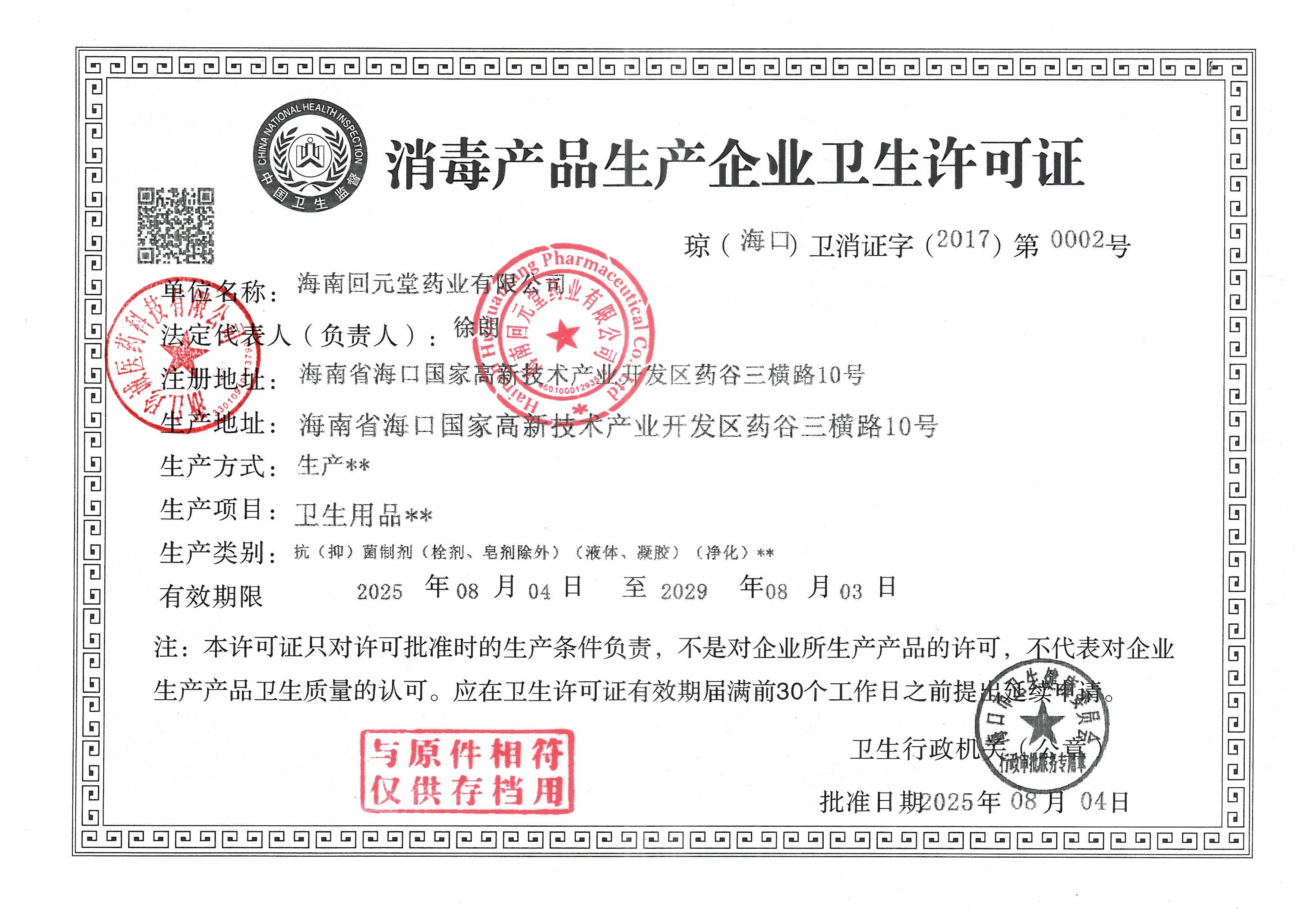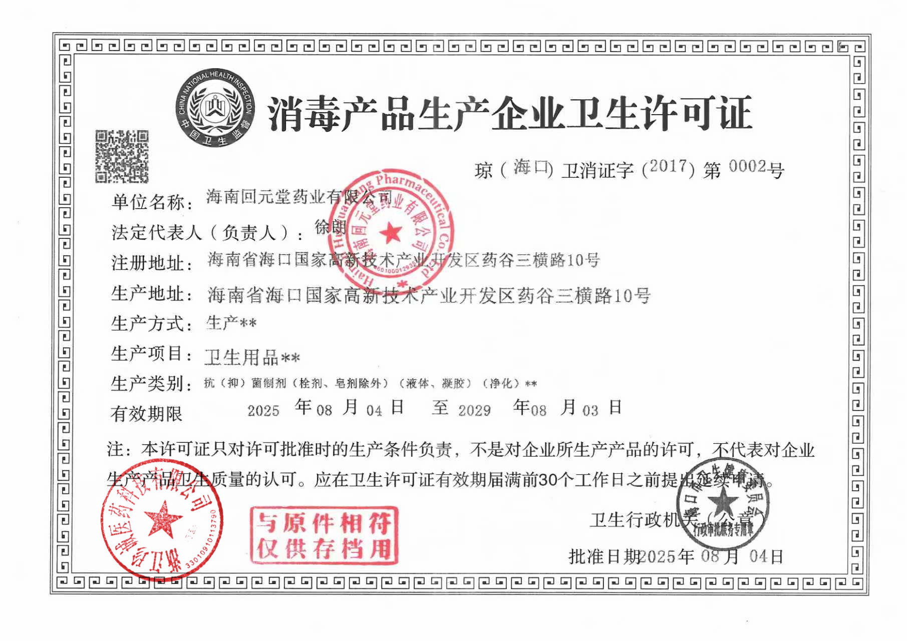 1 46000047 海南回元堂药业有限公司 消毒产品卫生许可证.jpg Oct 22, 2025 3:48:17 PM 查看下载