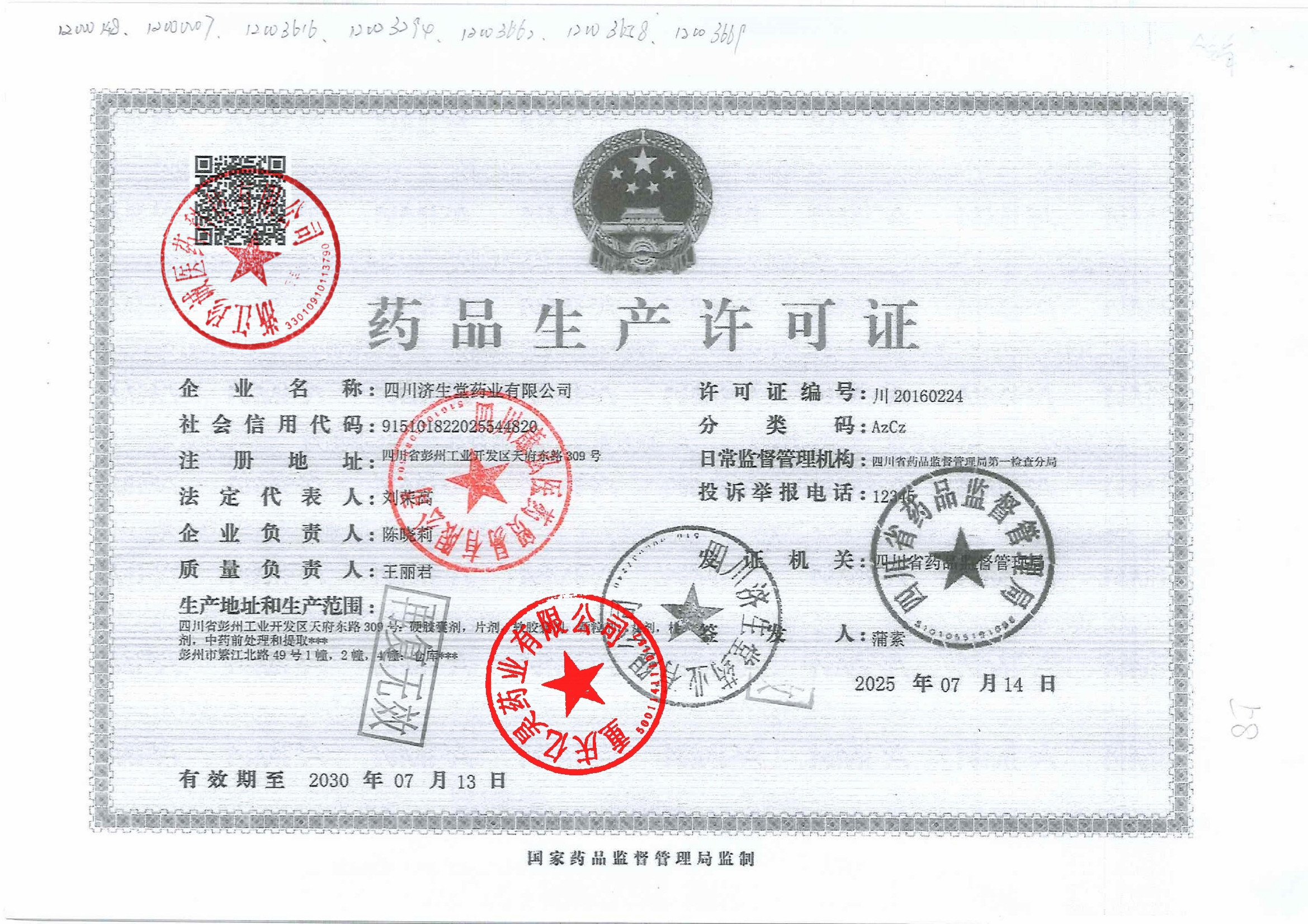 | 1 | 51000067 | 四川济生堂药业有限公司 | 药品生产许可证 (1).jpg | Jan 13, 2026 10:07:59 AM | 查看下载 | |