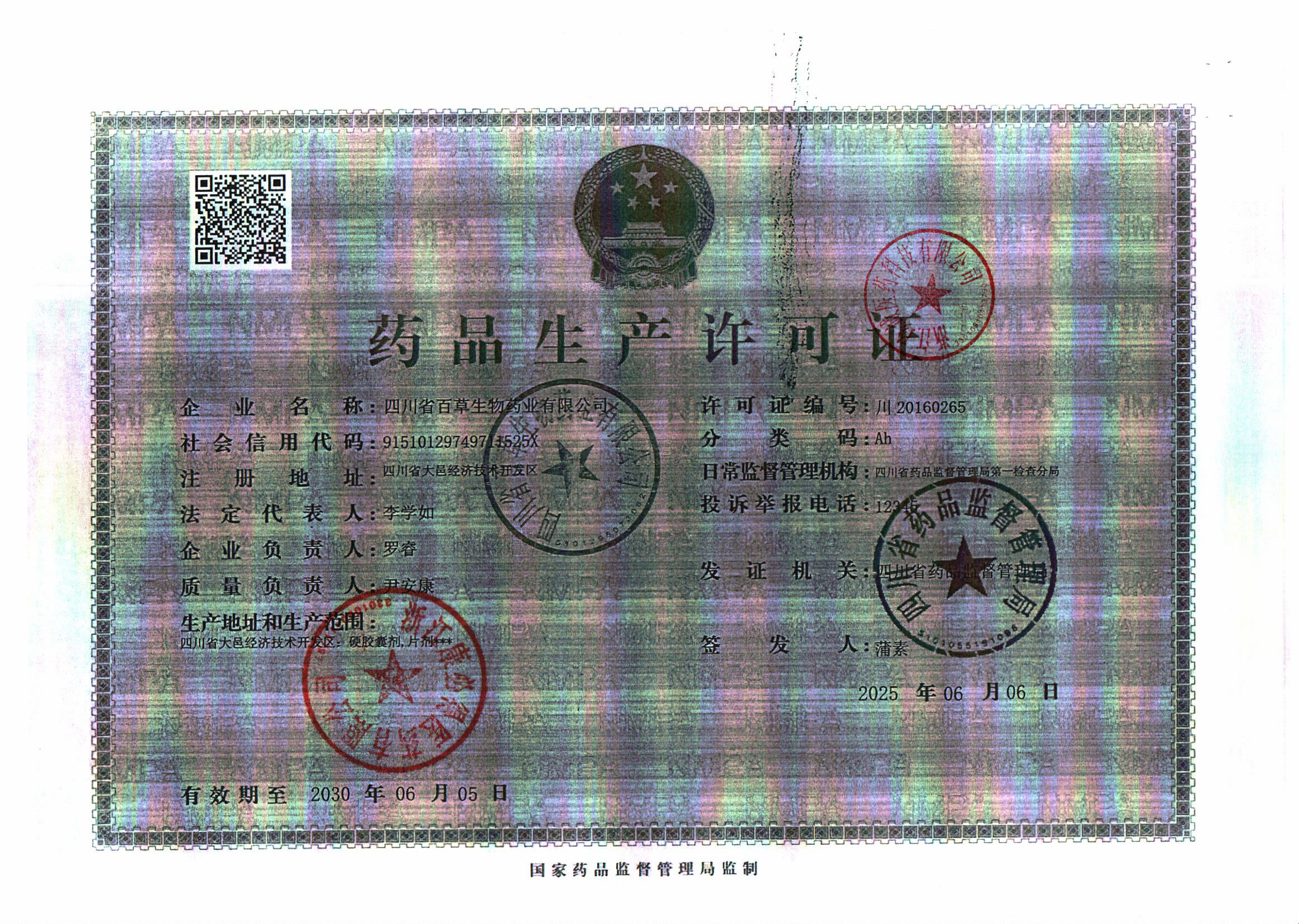 | 1 | 51012370 | 四川省百草生物药业有限公司 | 新药品生产许可证.jpg | Oct 17, 2025 9:48:18 AM | 查看下载 | |