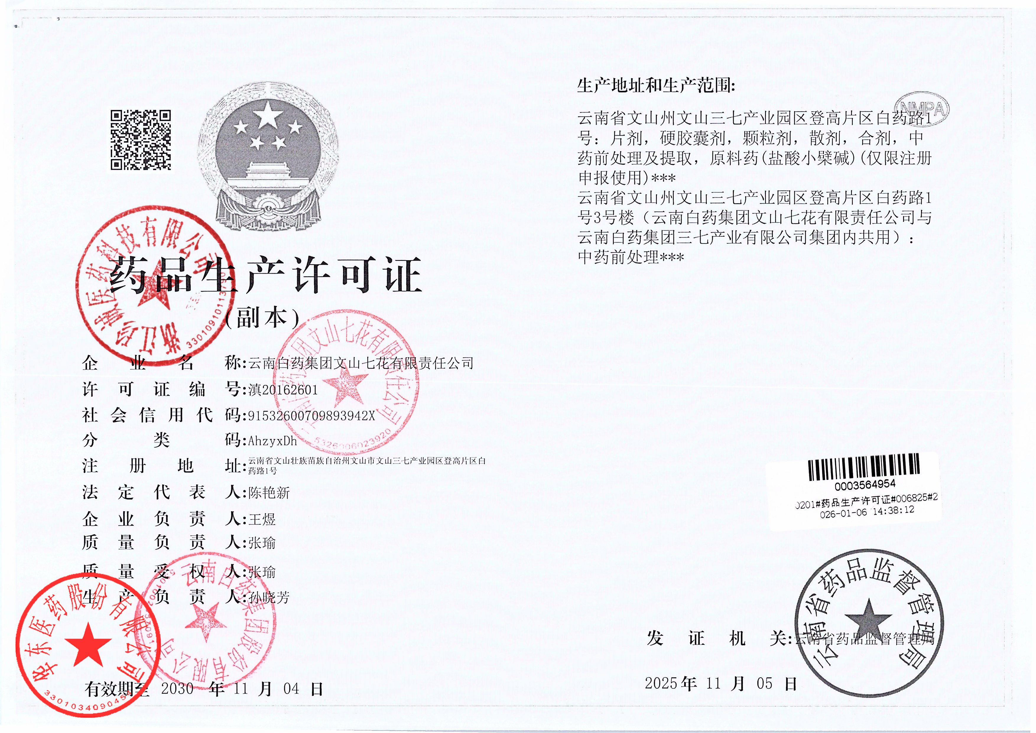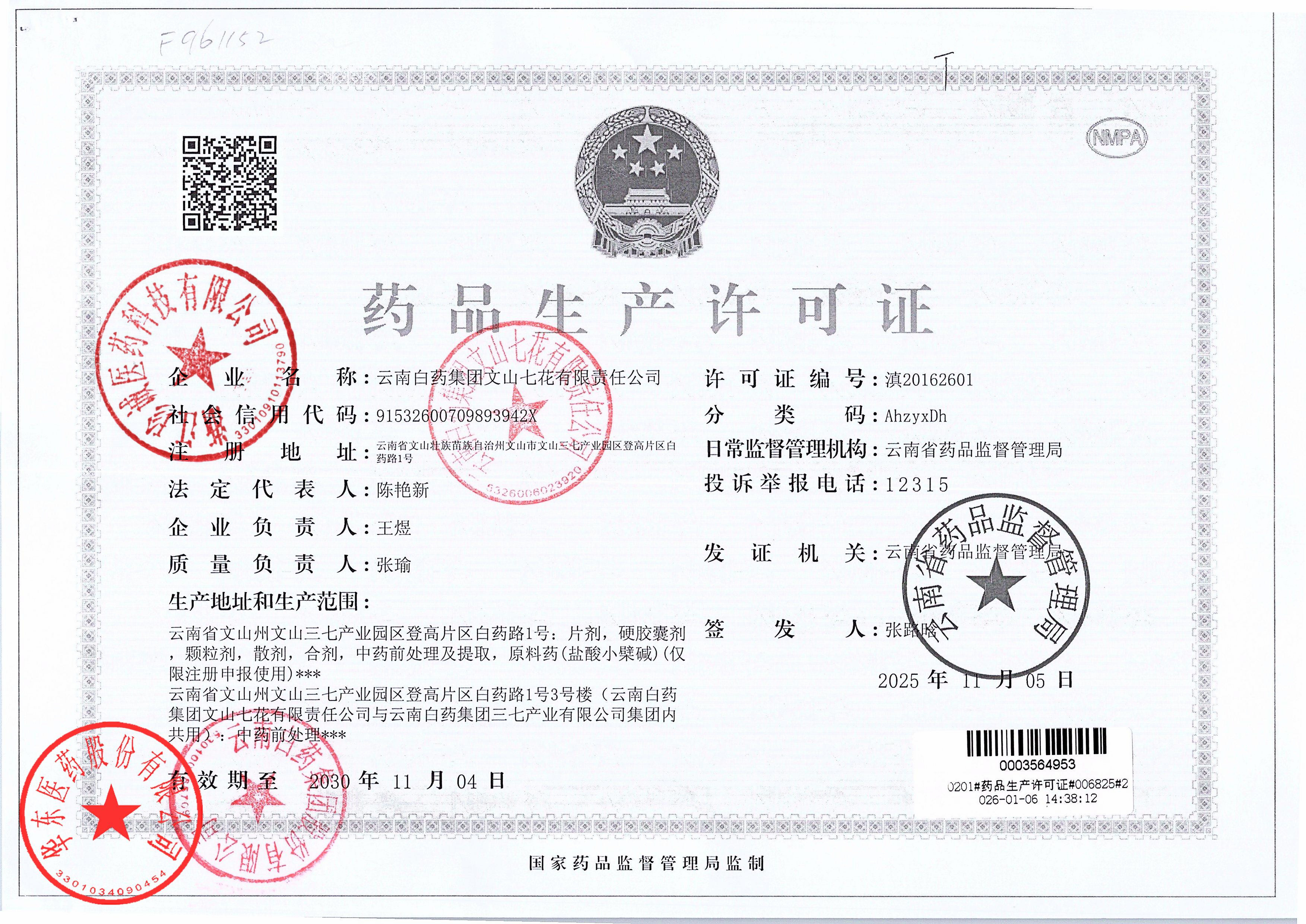 | 2 | 53000056 | 云南白药集团文山七花有限责任公司 | 许可证 (1).jpg | Jan 7, 2026 1:11:07 PM | 查看下载 | |
