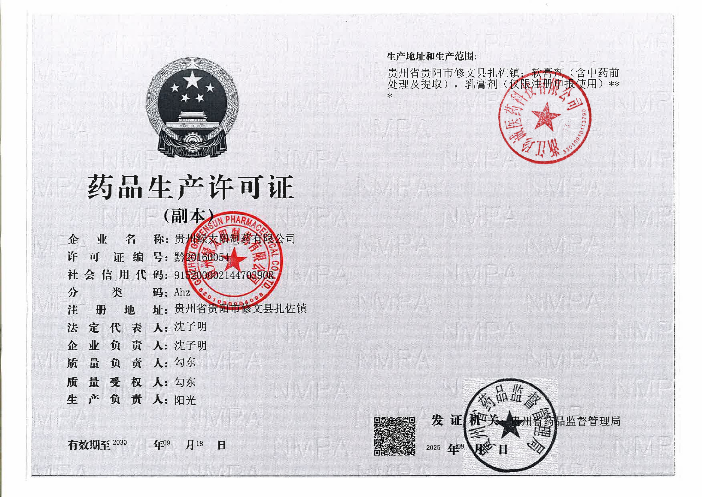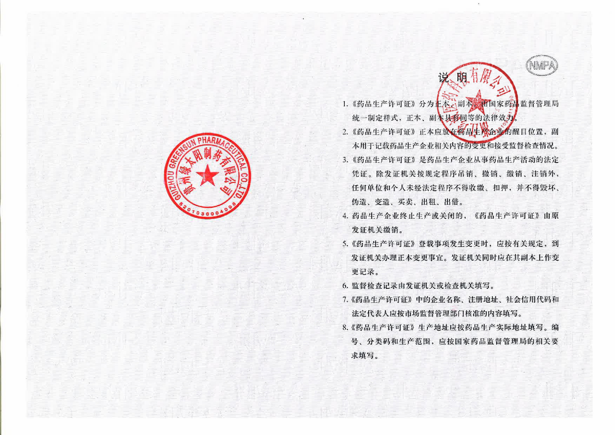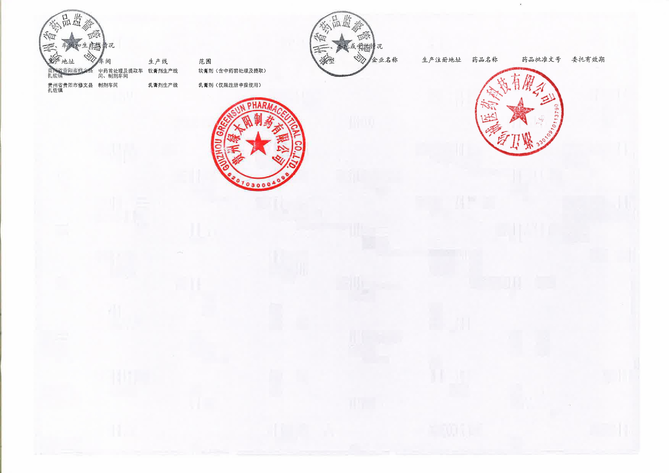 | 3 | Z99000570 | 贵州绿太阳制药有限公司 | 生产许可证盖章版(2025.11.5)(1)(1)0003.jpg | Jan 14, 2026 2:51:22 PM | 查看下载 | |