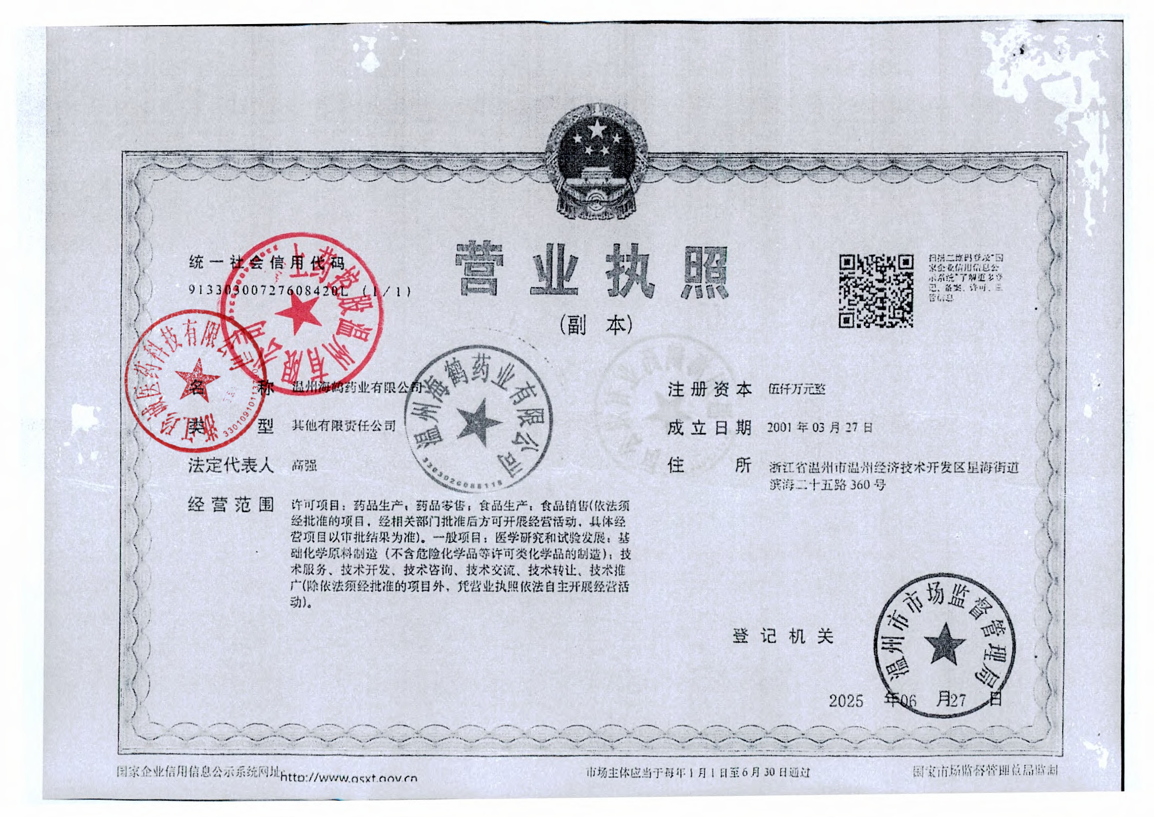 | 2 | Z99000589 | 温州海鹤药业有限公司 | 营业执照 (1).jpg | Jan 26, 2026 3:54:58 PM | 查看下载 | |