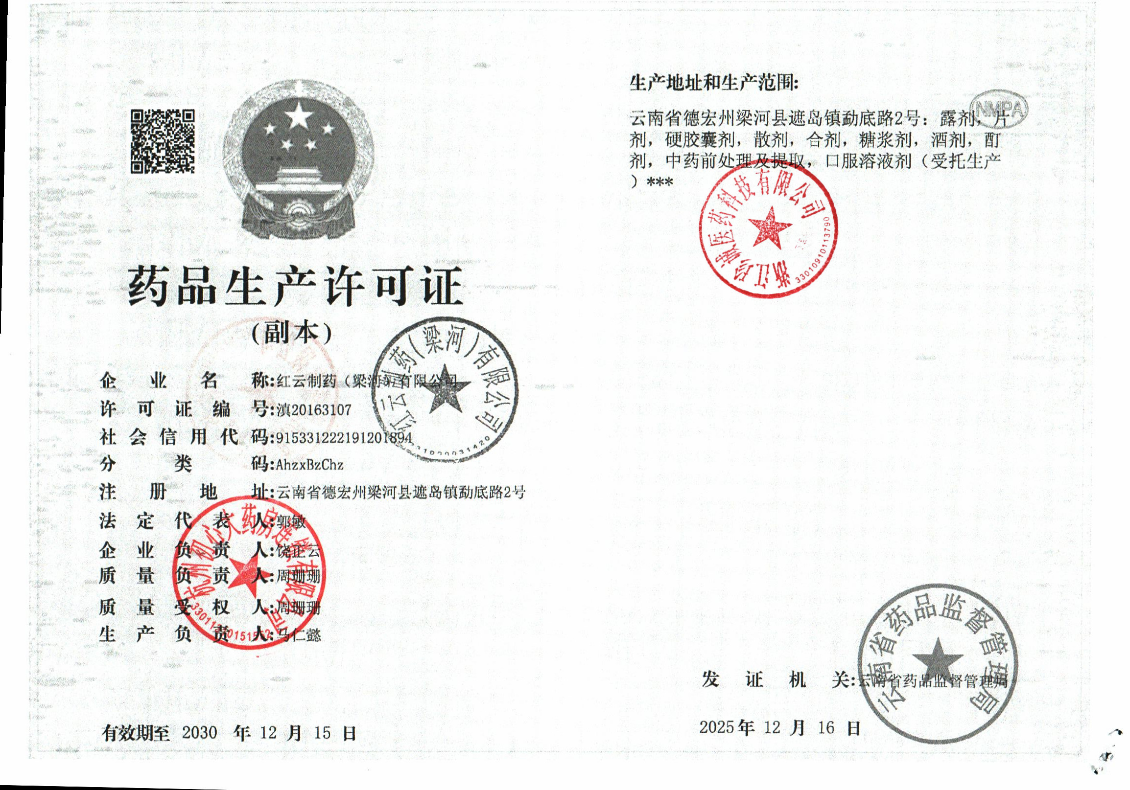 | 4 | Z99000660 | 红云制药(梁河)有限公司 | 许可证 (1).jpg | Dec 16, 2025 3:24:23 PM | 查看下载 | |
