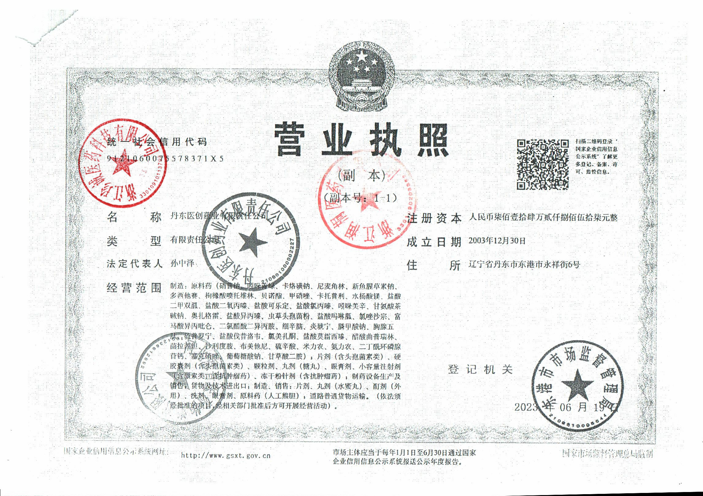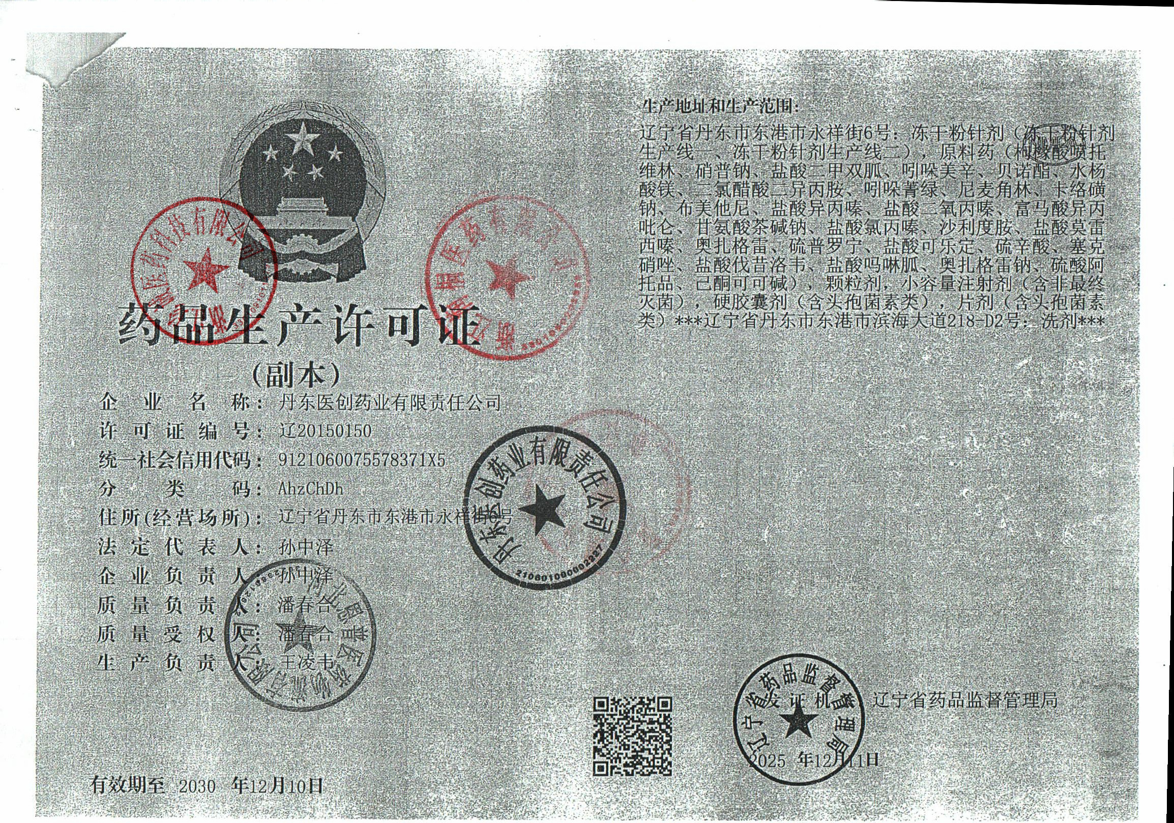 | 1 | Z99000980 | 丹东医创药业有限责任公司 | 许可证.jpg | Apr 21, 2026 2:43:40 PM | 查看下载 | |