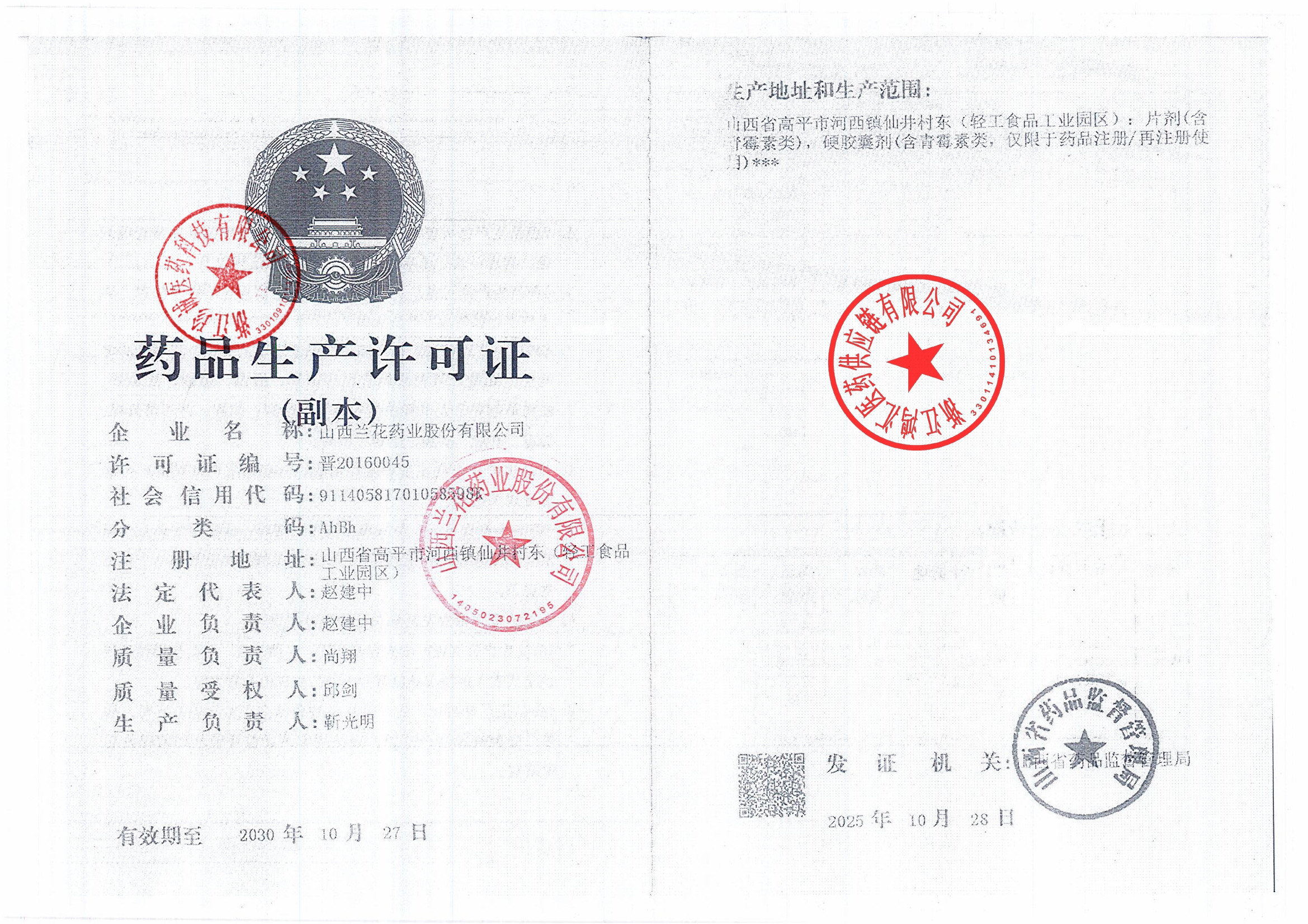 | 4 | Z99001122 | 山西兰花药业股份有限公司 | 药品生产许可证.jpg | Sep 26, 2025 11:05:00 AM | 查看下载 | |