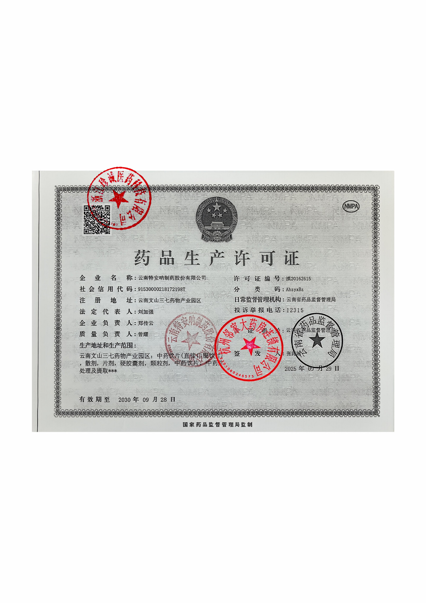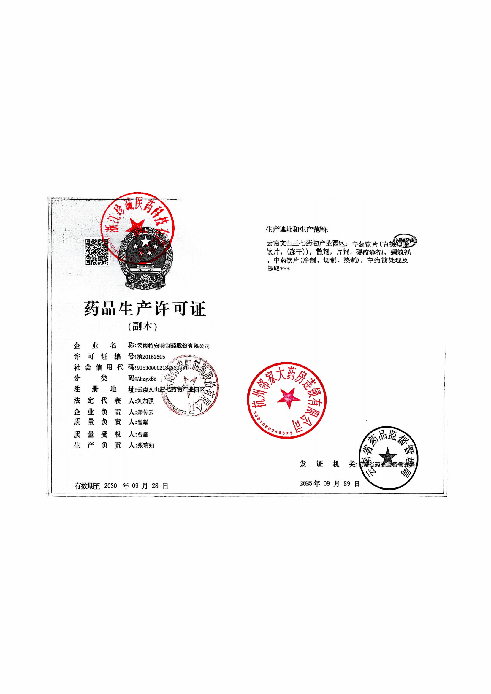| 2 | Z99002382 | 云南特安呐制药股份有限公司 | 药品生产许可证 (2).jpg | Oct 10, 2025 3:09:55 PM | 查看下载 | |