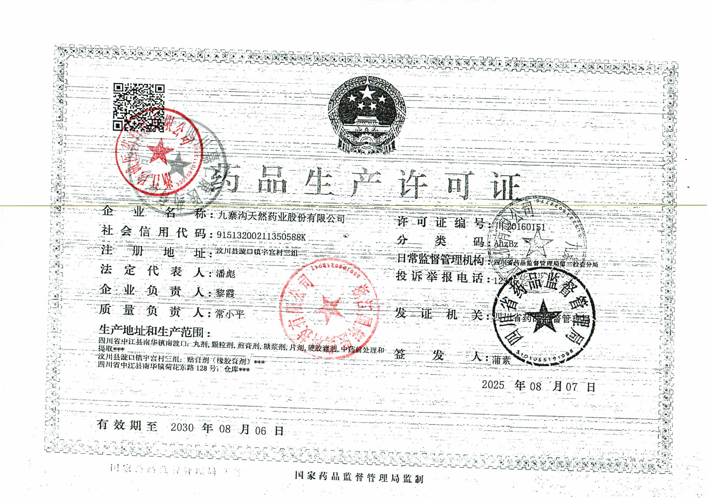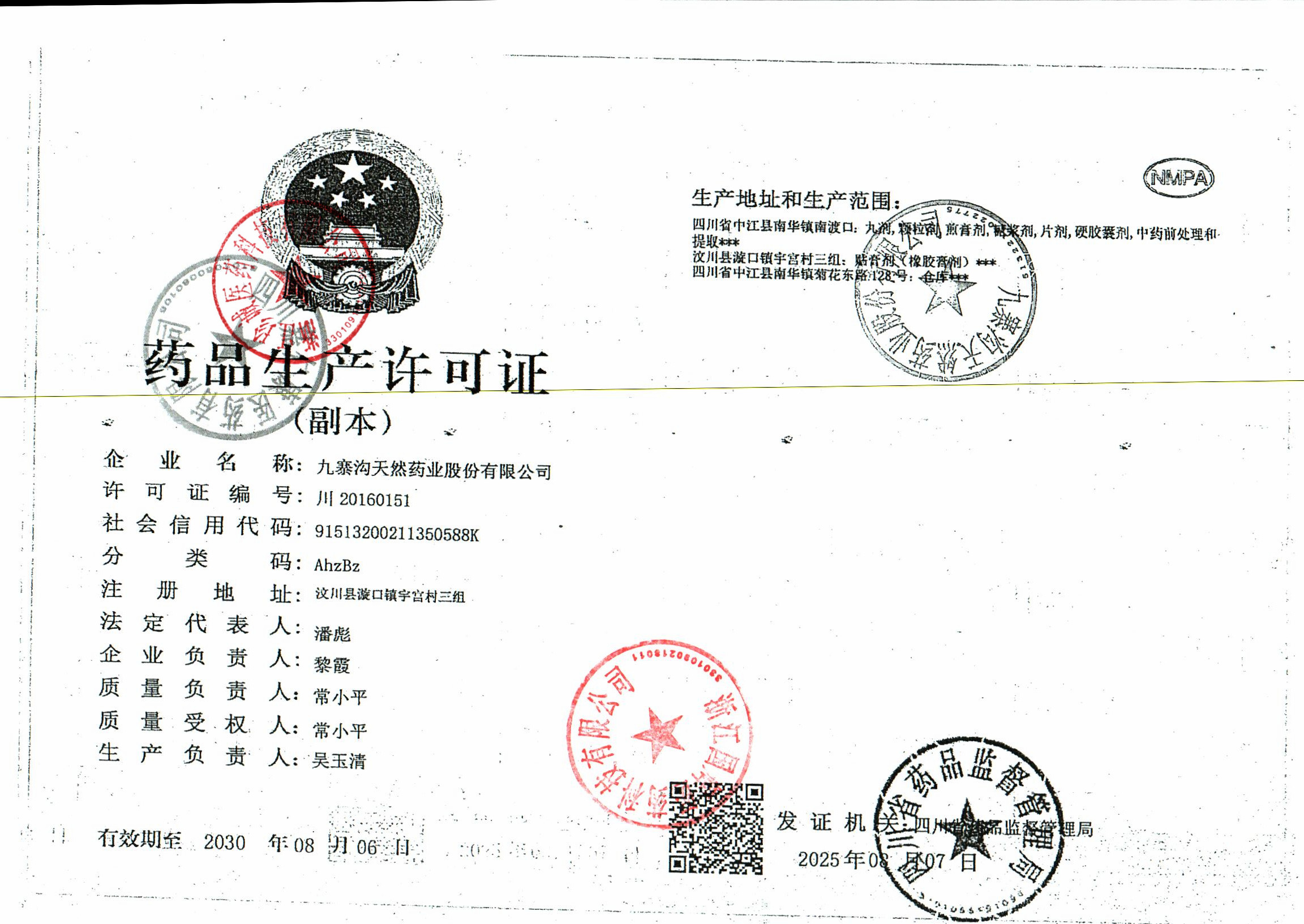 5 | Z99002600 | 九寨沟天然药业股份有限公司 | 药品生产许可证 (1).jpg | Oct 17, 2025 3:14:05 PM | 查看下载 | |