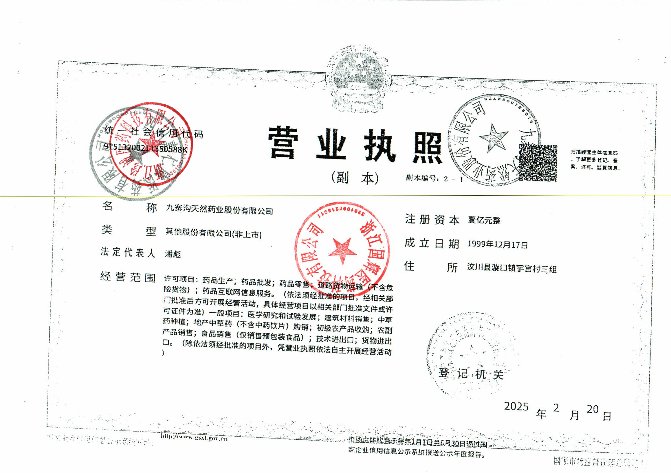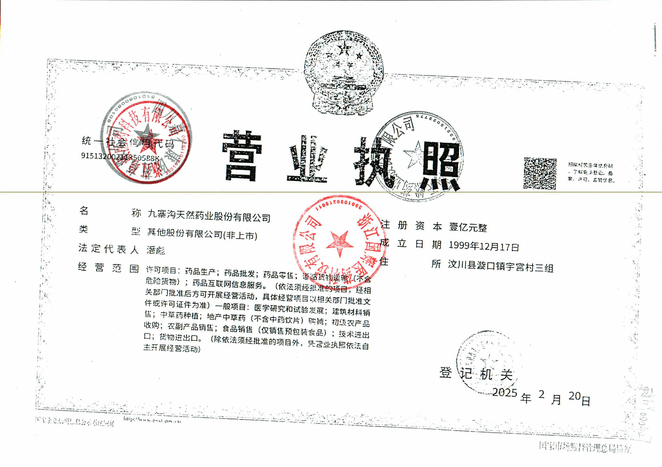 7 | Z99002600 | 九寨沟天然药业股份有限公司 | 营业执照 (2).jpg | Oct 17, 2025 3:14:05 PM | 查看下载 |