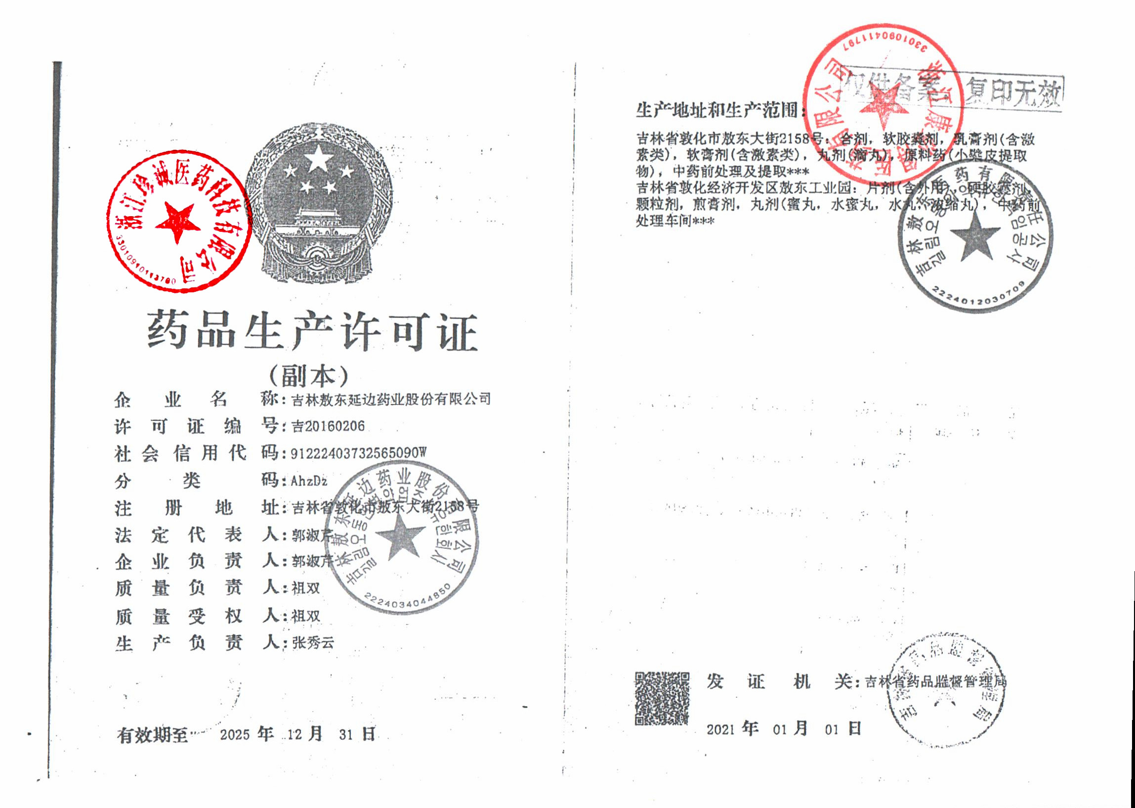 | 3 | Z99002624 | 吉林敖东延边药业股份有限公司 | 药品生产许可证.jpg | Aug 21, 2025 9:46:15 AM | 查看下载 | |