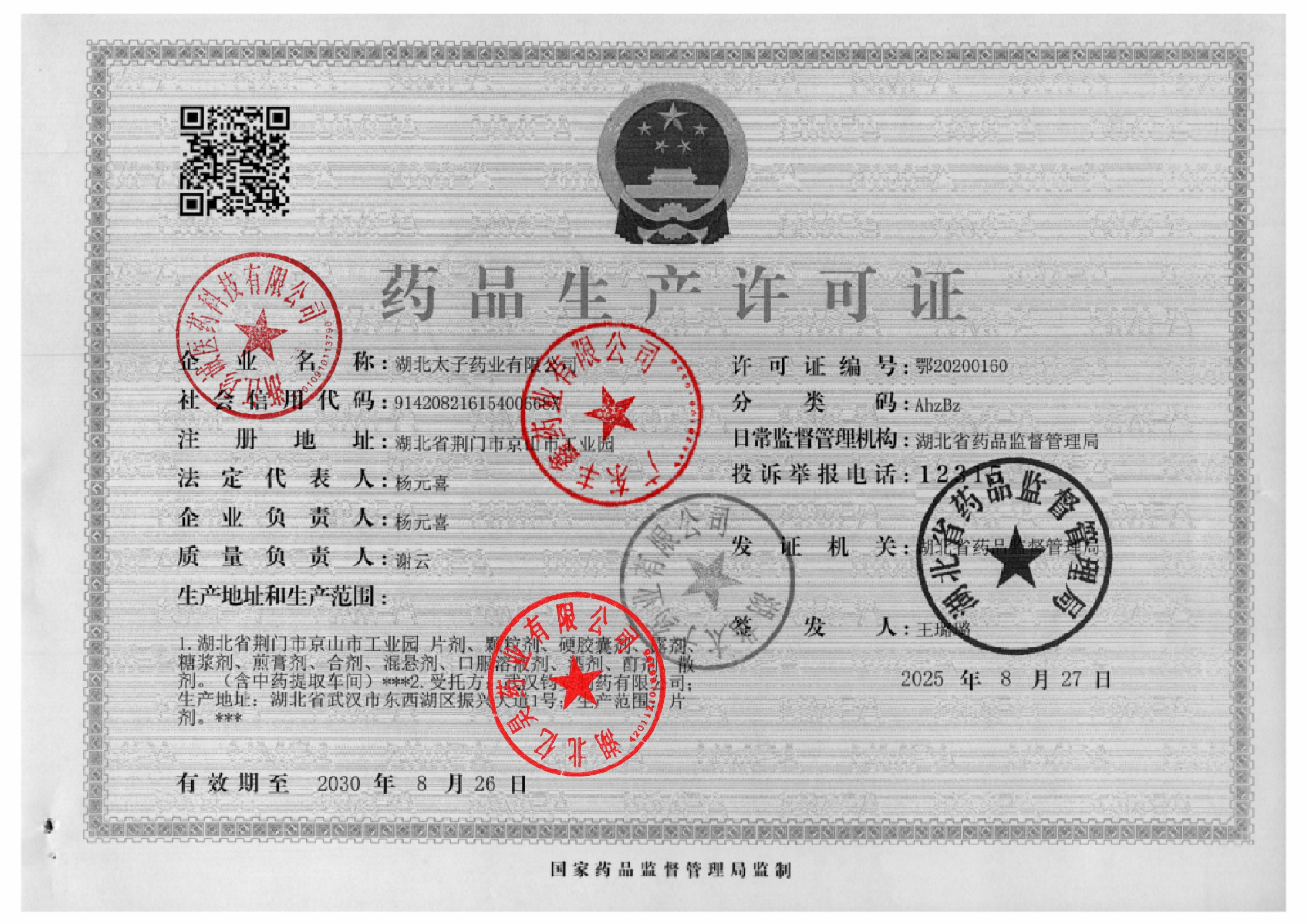1 Z99002764 湖北太子药业有限公司 药品生产许可证0001.jpg Nov 13, 2025 3:42:49 PM 查看下载