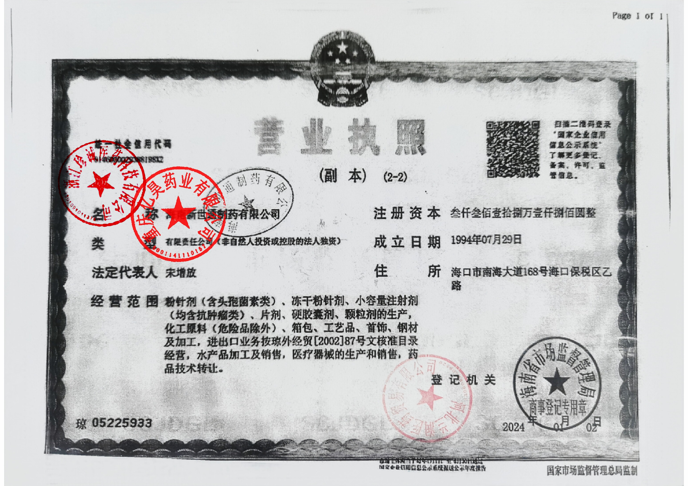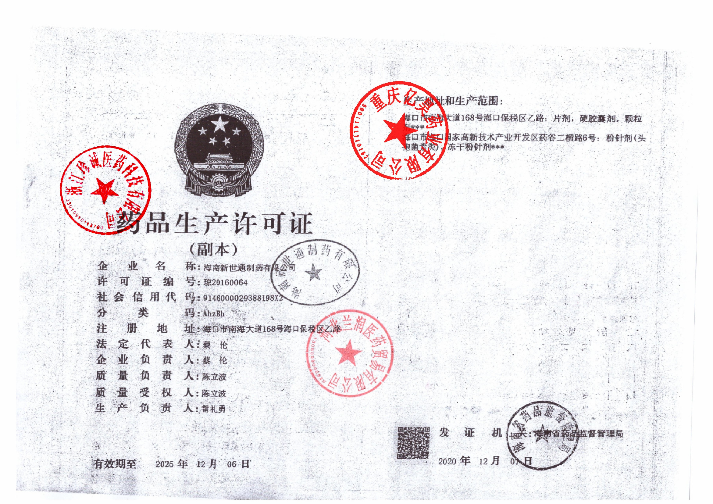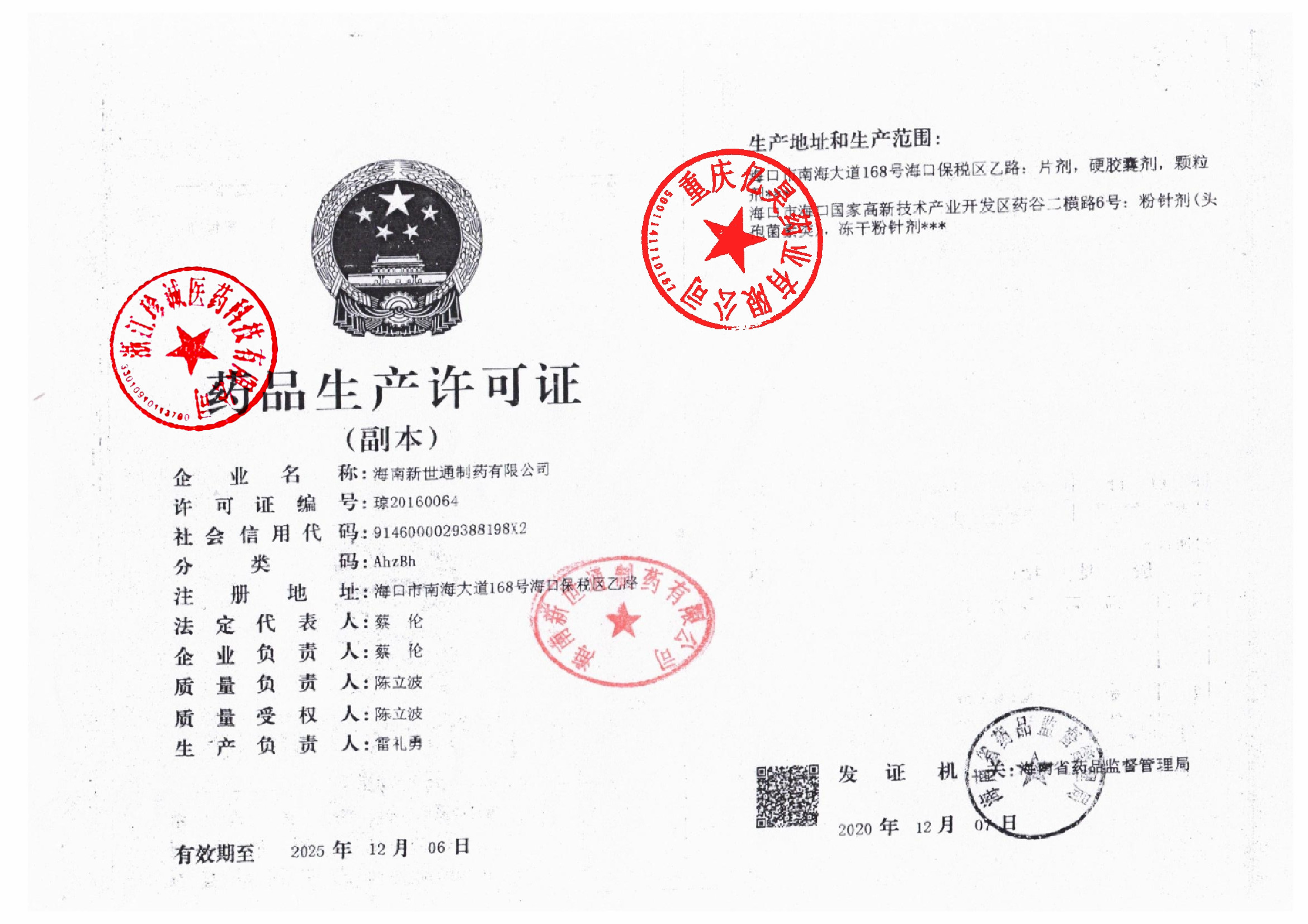 | 1 | Z99002818 | 海南新世通制药有限公司 | 药品生产许可证0002.jpg | Oct 13, 2025 3:50:19 PM | 查看下载 | |