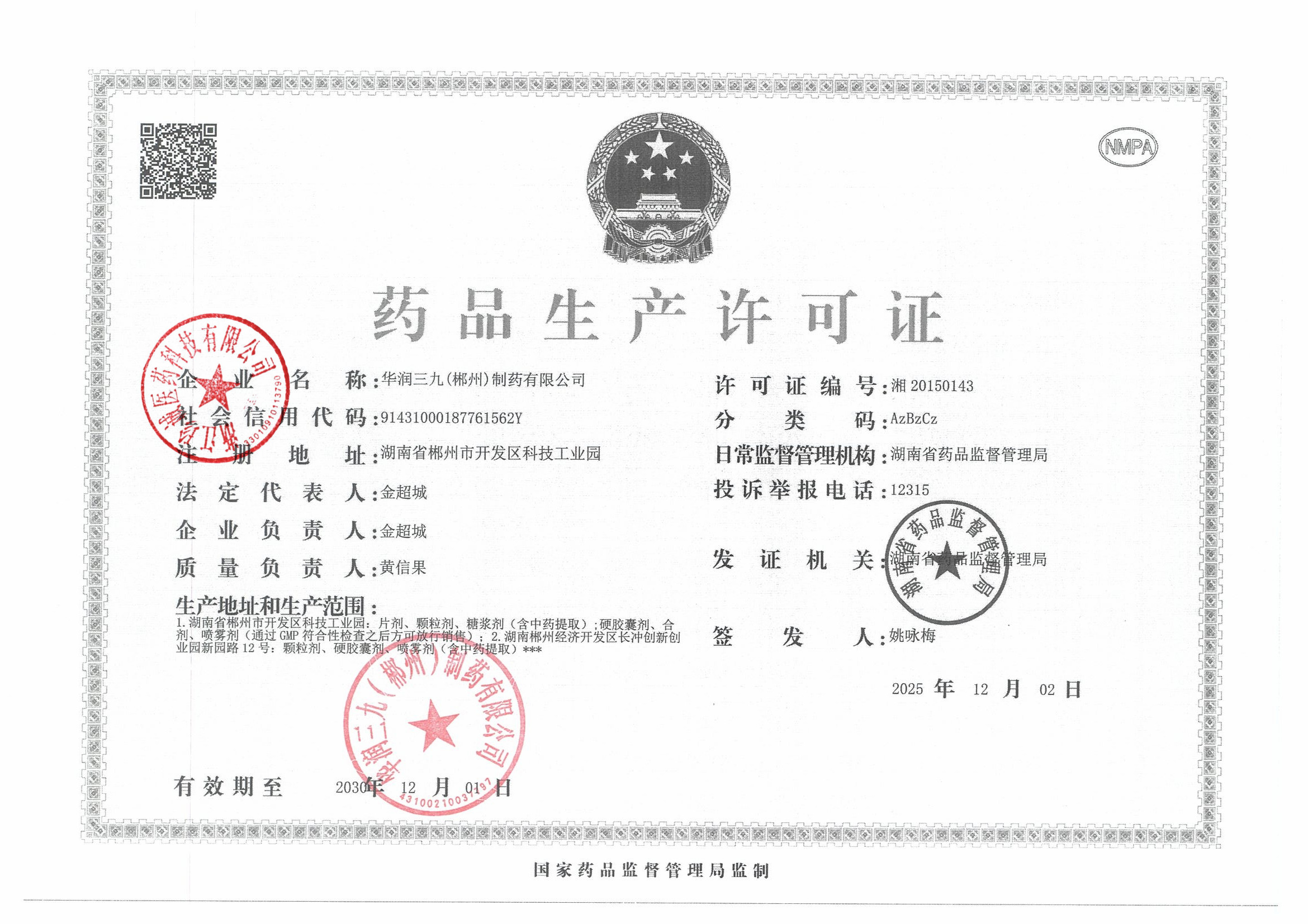 1 Z99003040 华润三九(郴州)制药有限公司 许可证.jpg Dec 9, 2025 2:50:53 PM 查看下载