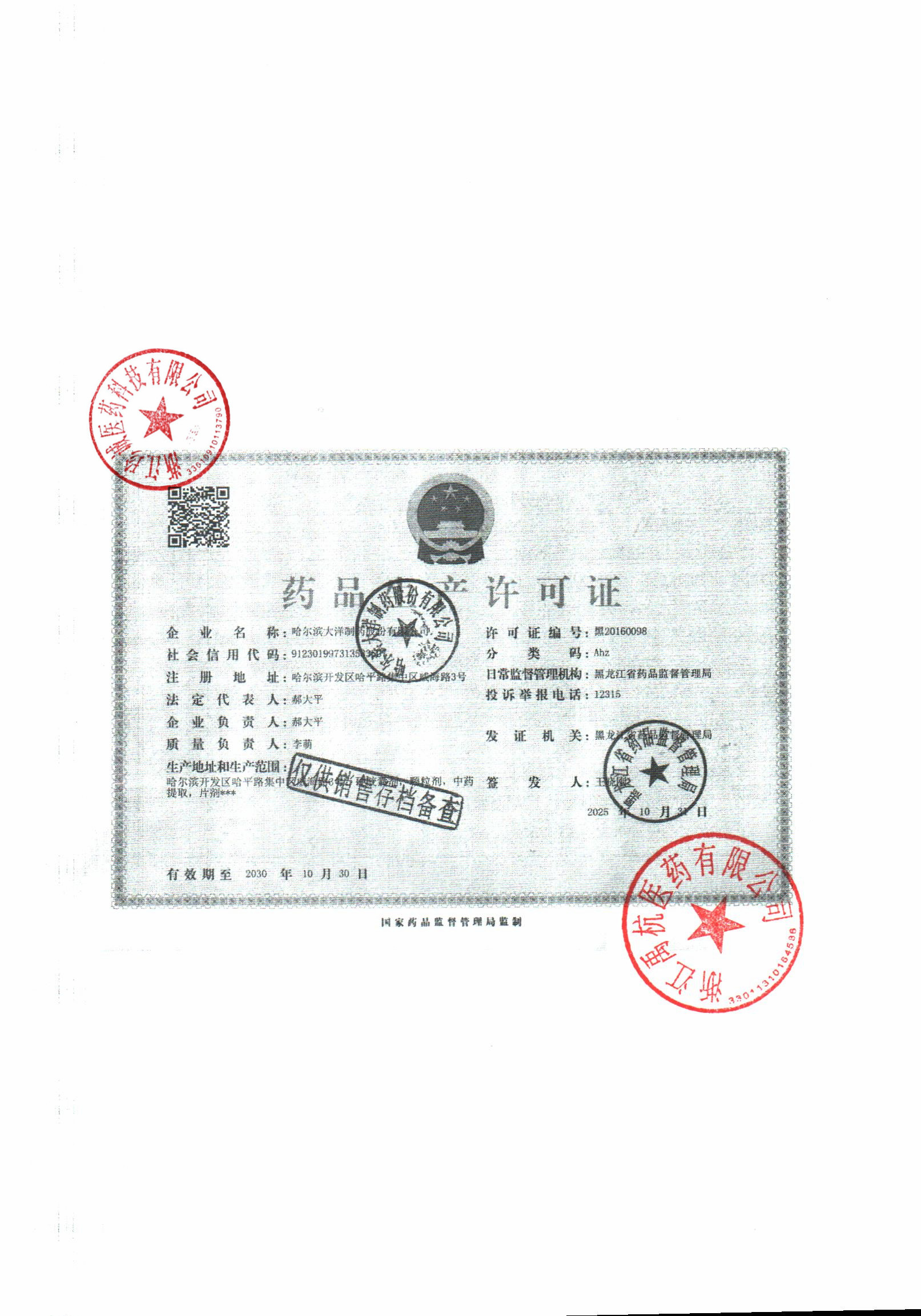 2 Z99003198 哈尔滨大洋制药股份有限公司 许可证.jpg Apr 16, 2026 2:09:13 PM 查看下载