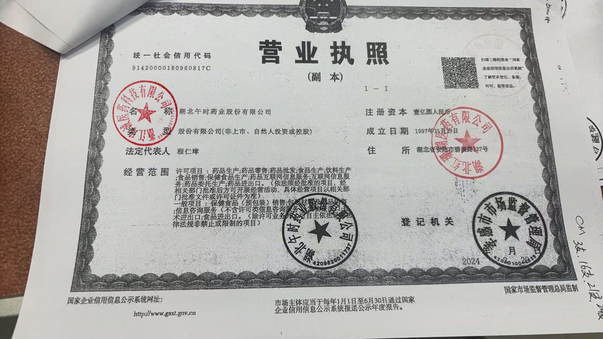 1 Z99003202 湖北午时药业股份有限公司 营业执照.jpg Jan 19, 2026 10:50:09 AM 查看下载