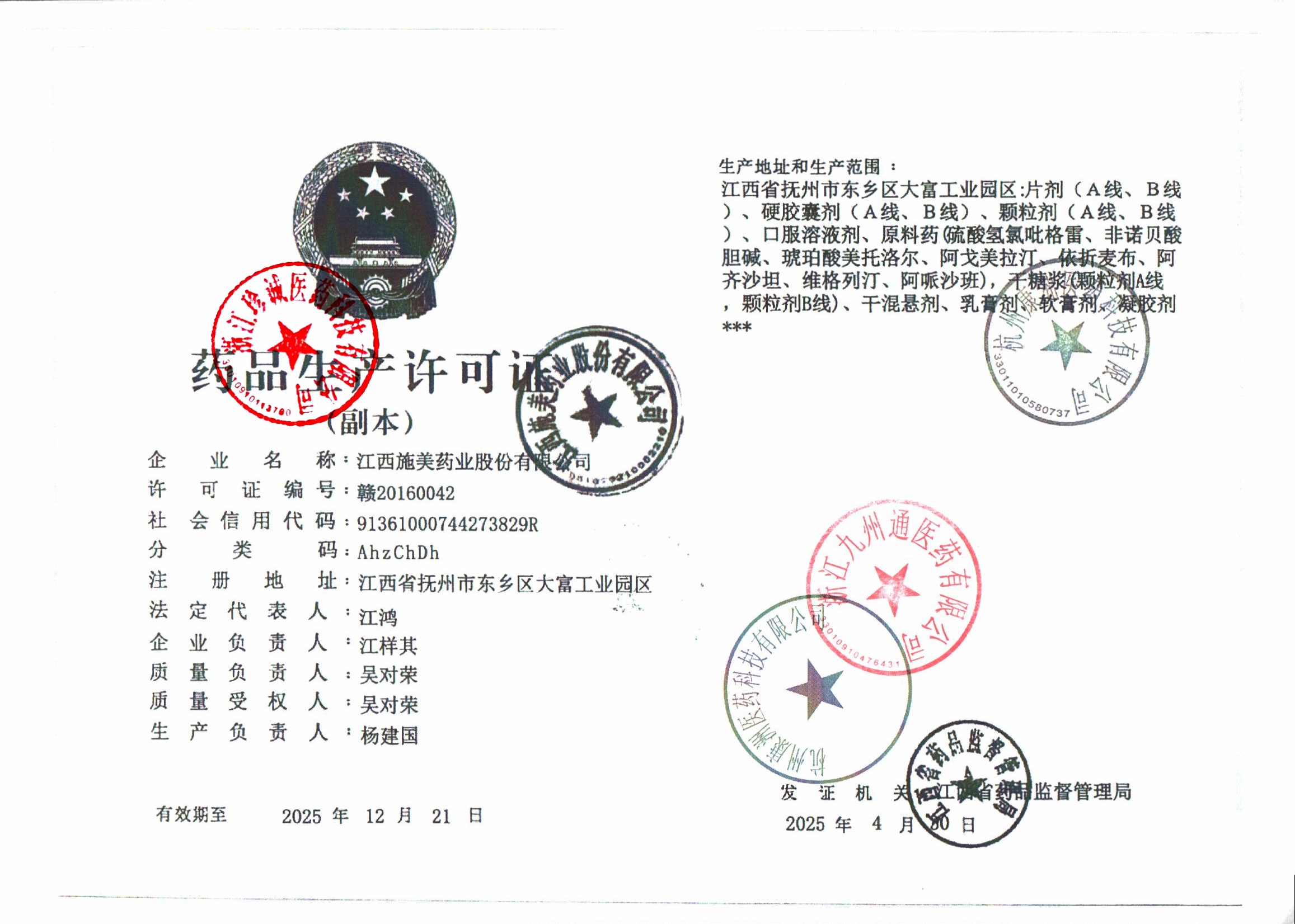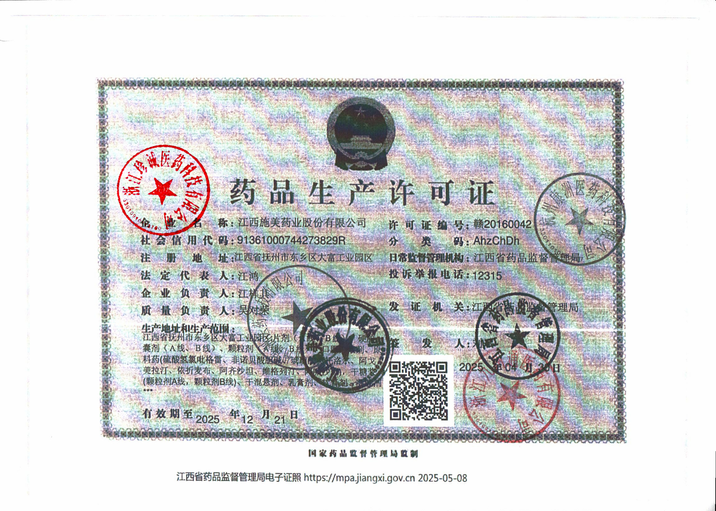 3 | Z99003286 | 江西施美药业股份有限公司 | 药品生产许可证 (2).jpg | Sep 3, 2025 9:36:15 AM | 查看下载 | |