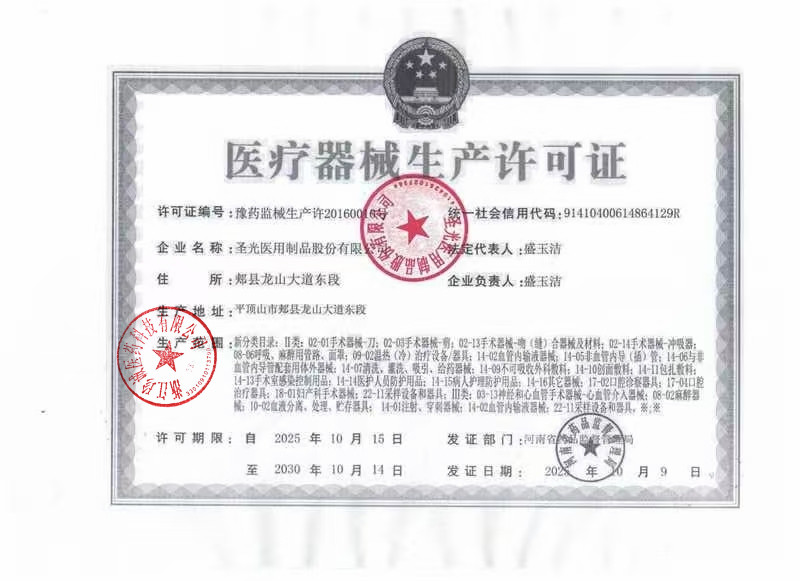 | 1 | Z99003314 | 圣光医用制品股份有限公司 | 新医疗器械生产许可证.jpg | Oct 22, 2025 4:56:24 PM | 查看下载 | |
