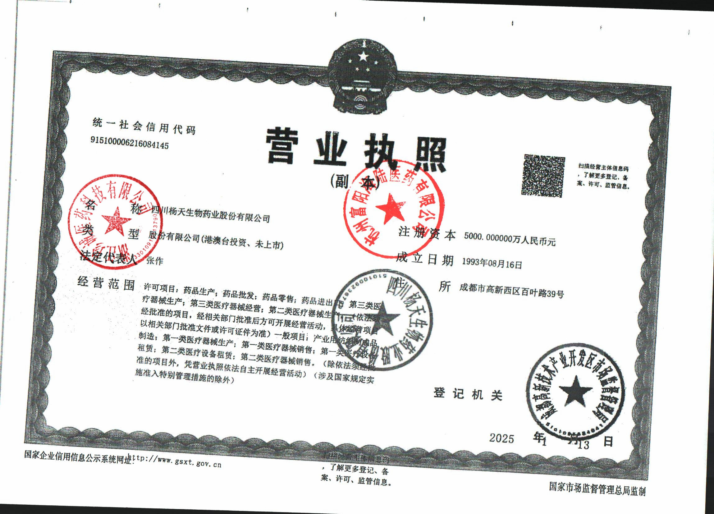 | 2 | Z99003474 | 四川杨天生物药业股份有限公司 | 营业执照.jpg | Nov 25, 2025 1:51:58 PM | 查看下载 | |