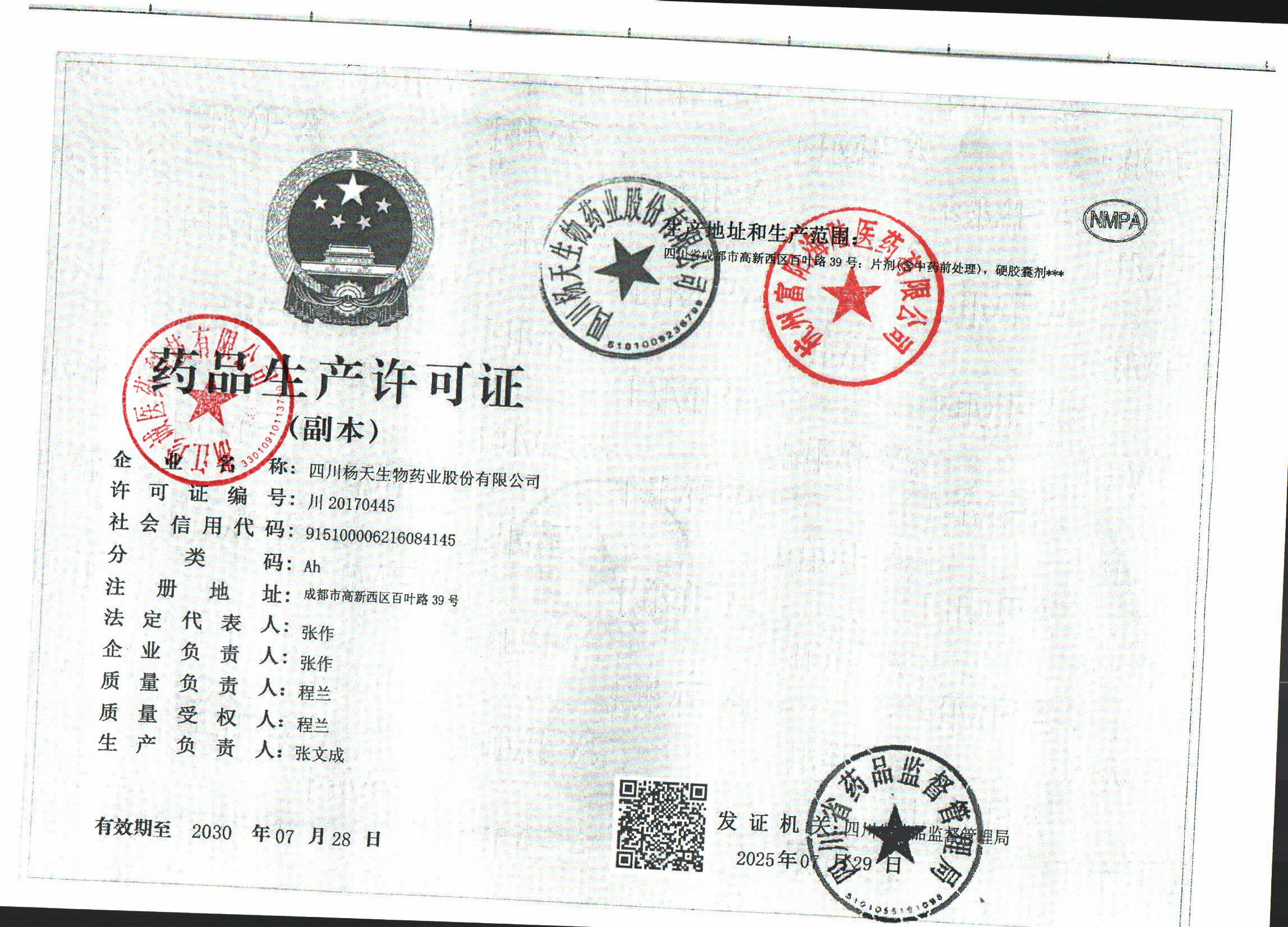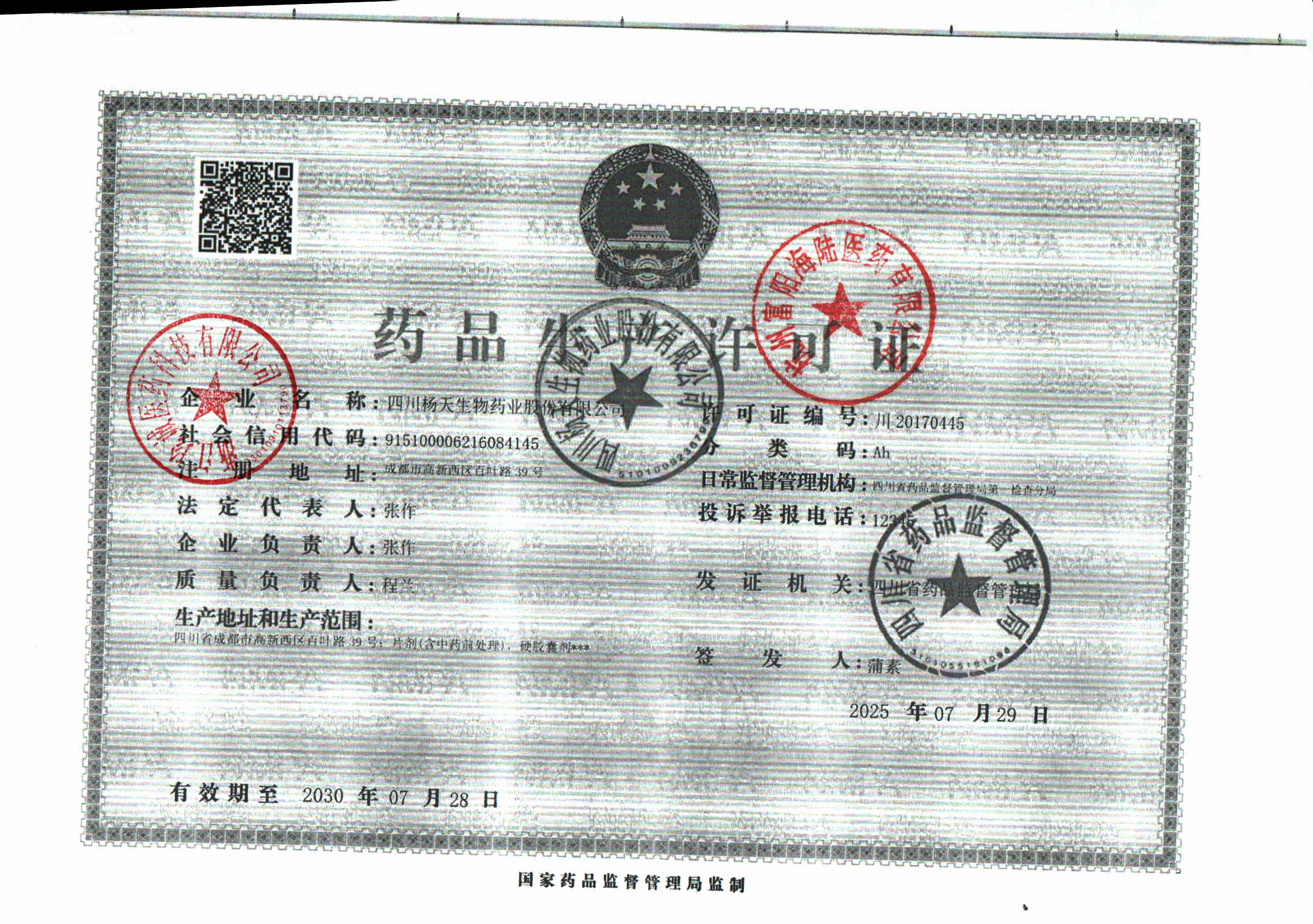| 5 | Z99003474 | 四川杨天生物药业股份有限公司 | 许可证 (1).jpg | Nov 25, 2025 1:51:58 PM | 查看下载 |