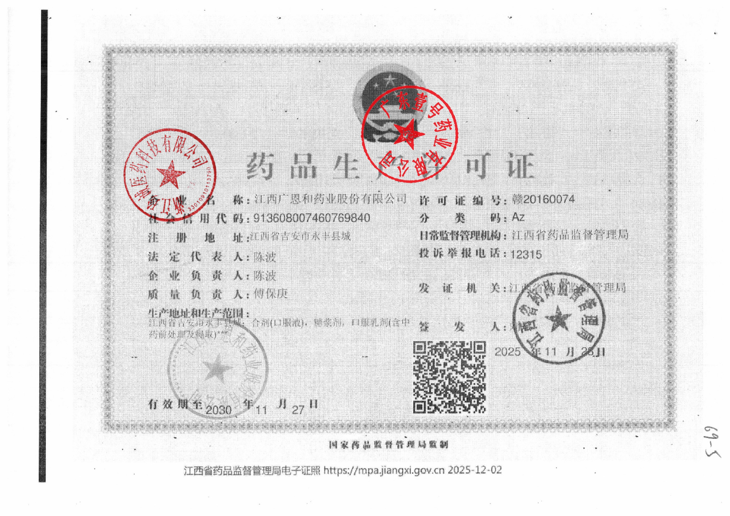 | 2 | Z99003568 | 江西广恩和药业股份有限公司 | 药品生产许可.jpg | Feb 10, 2026 11:08:04 AM | 查看下载 | |