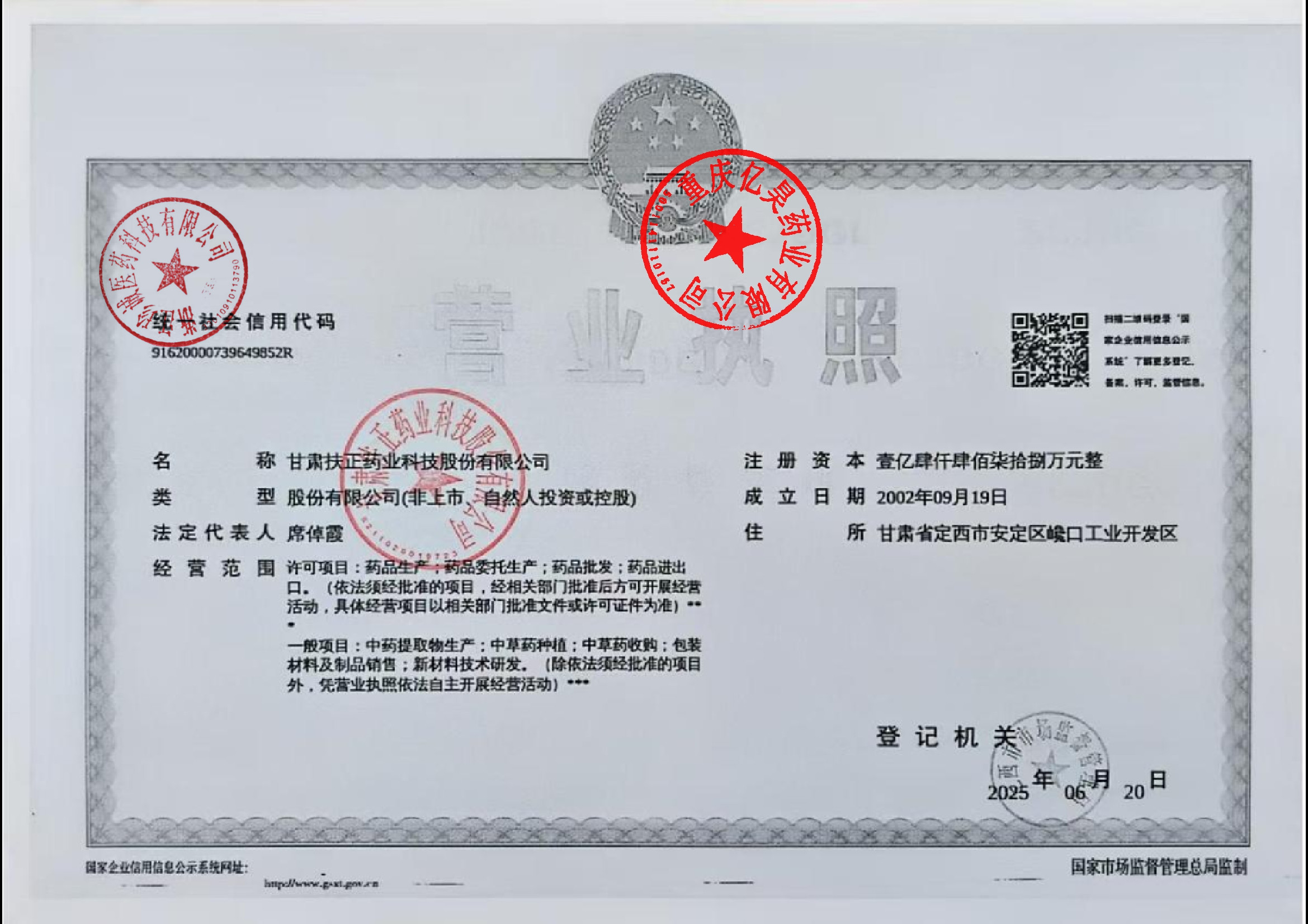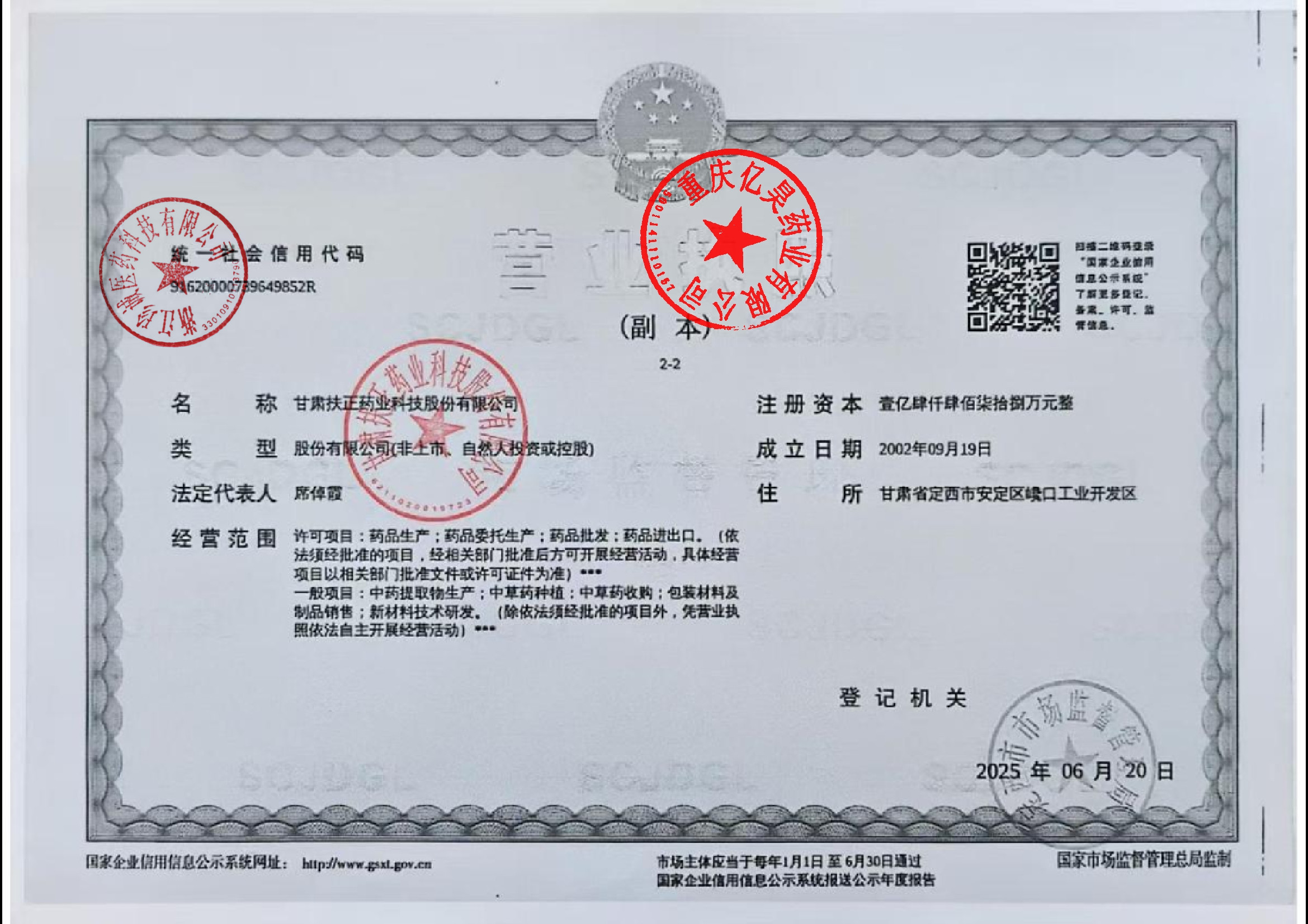 | 2 | Z99003596 | 甘肃扶正药业科技股份有限公司 | 营业执照 (2).jpg | Apr 1, 2026 3:07:15 PM | 查看下载 | |