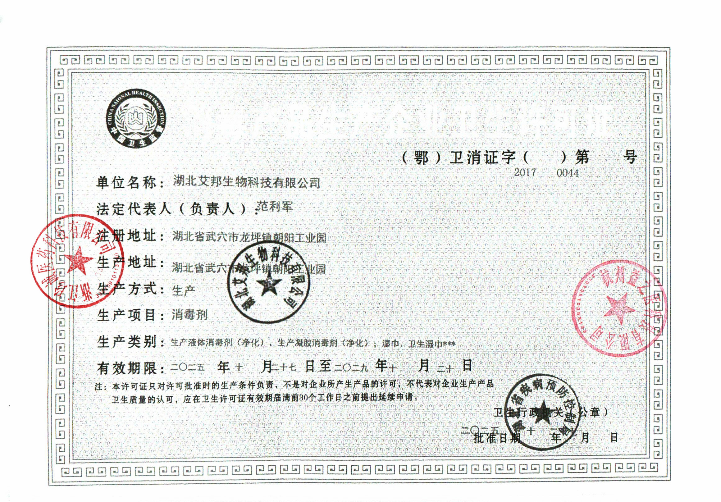 | 1 | Z99003764 | 湖北艾邦生物科技有限公司 | 新消毒产品卫生许可证.jpg | Nov 3, 2025 10:05:26 AM | 查看下载 | |