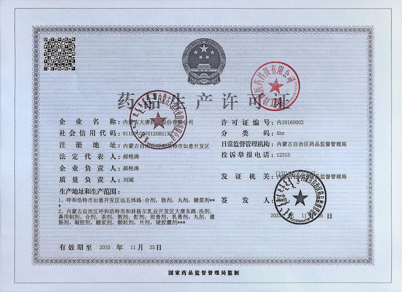 | 1 | Z99003856 | 内蒙古大唐药业股份有限公司 | 许可证 (2).jpg | Dec 3, 2025 12:00:00 AM | 查看下载 | |