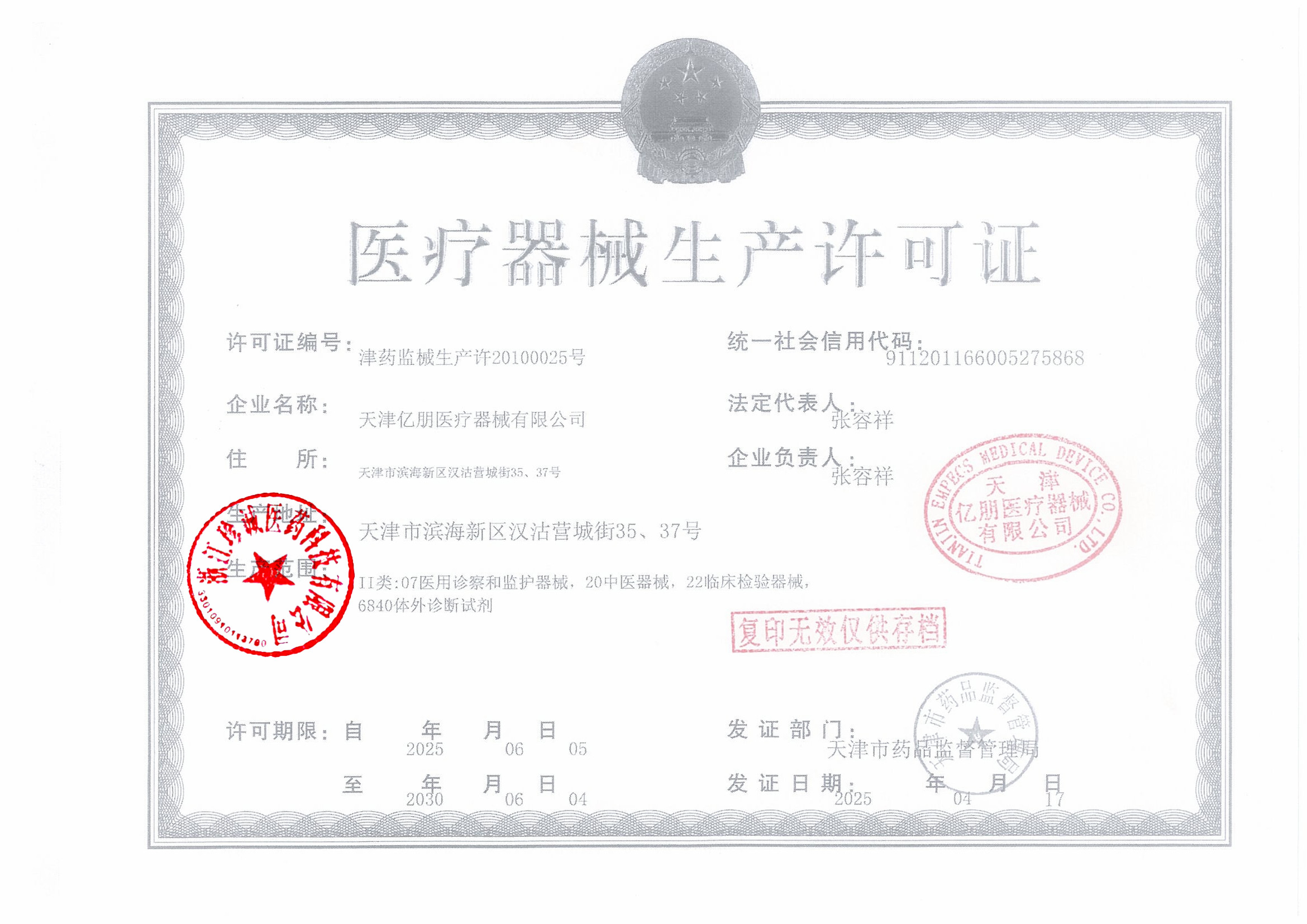| 3 | Z99004152 | 天津亿朋医疗器械有限公司 | 医疗器械生产许可证副本.jpg | Jun 27, 2023 9:46:20 AM | 查看下载 | |