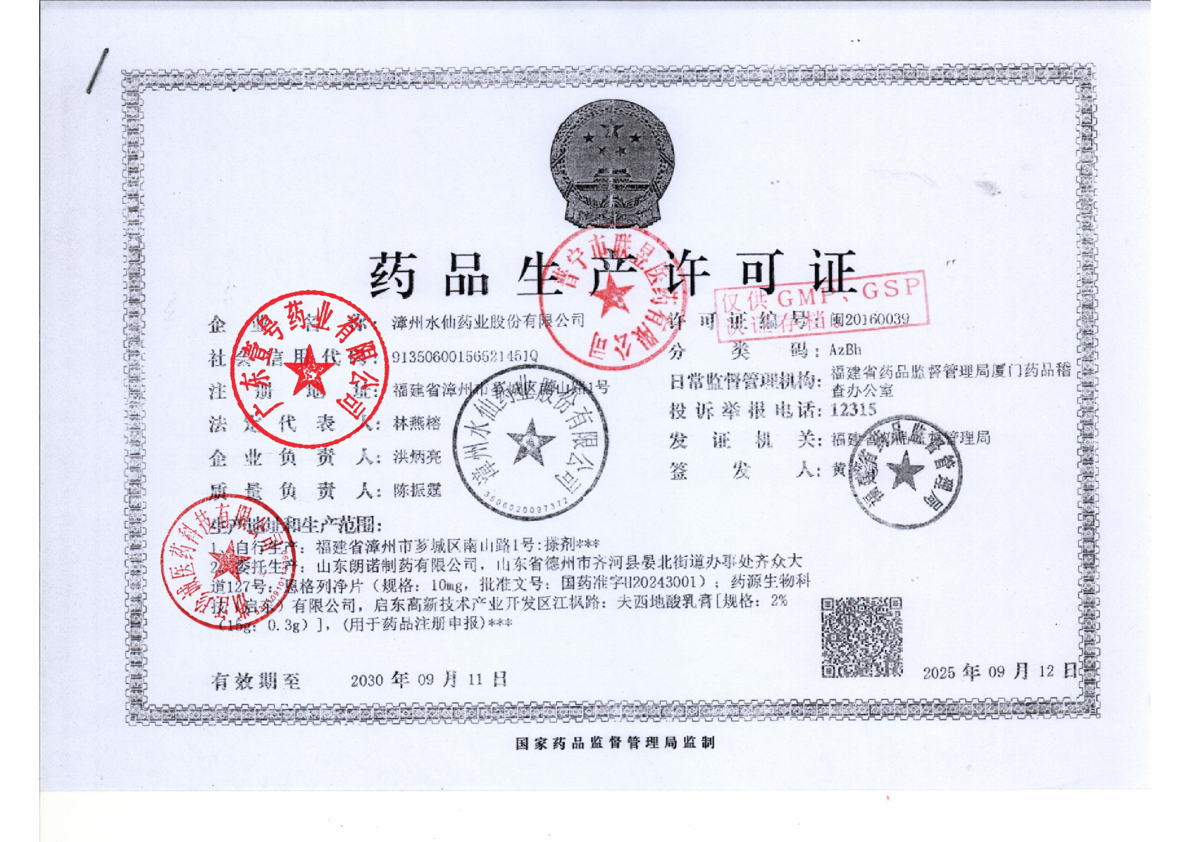 1 Z99004180 漳州水仙药业股份有限公司 药品生产许可证.jpg Jan 19, 2026 2:16:33 PM 查看下载