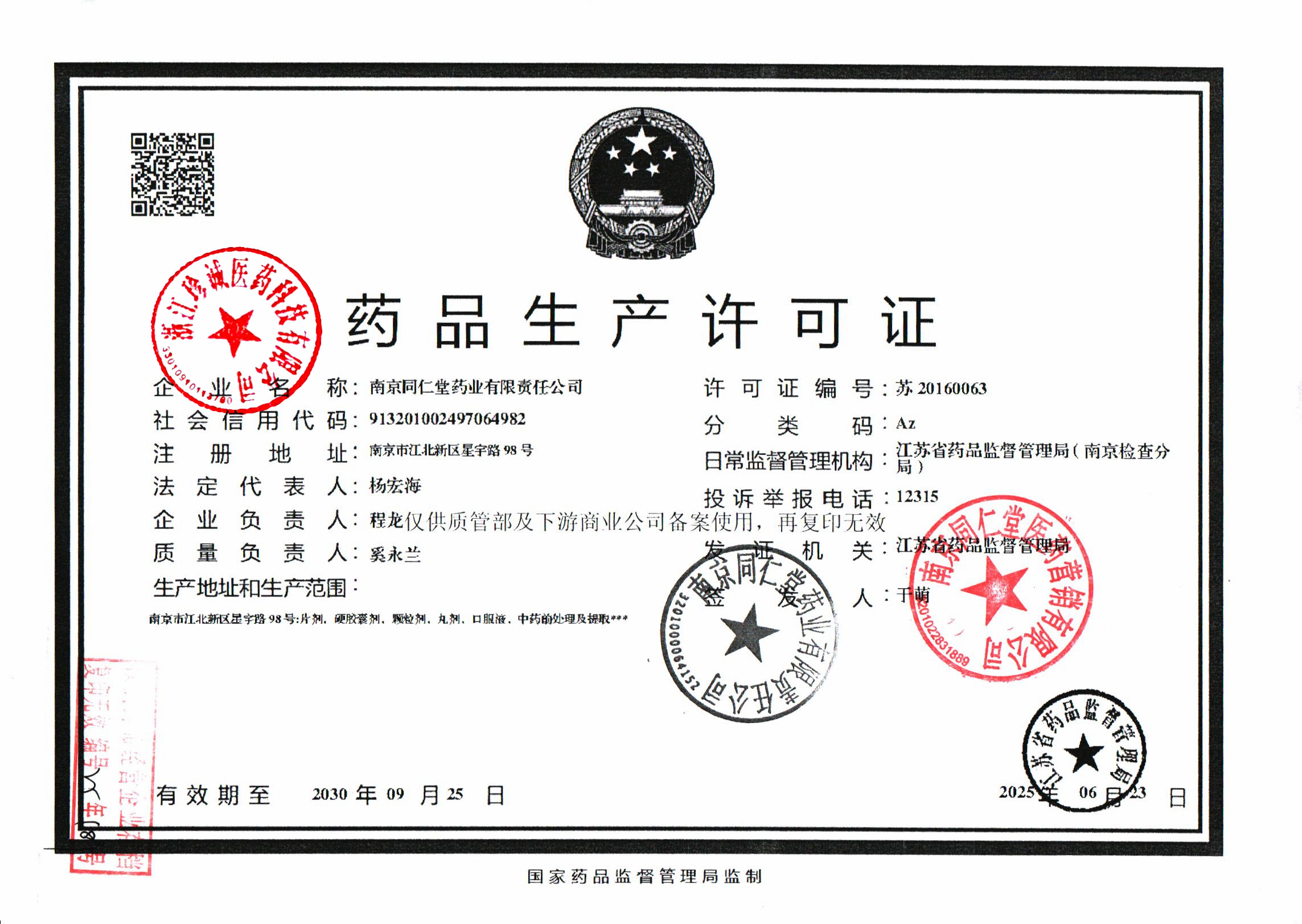 | 1 | Z99004208 | 南京同仁堂药业有限责任公司 | 药品生产许可证新.jpg | Sep 18, 2025 10:57:22 AM | 查看下载 | |