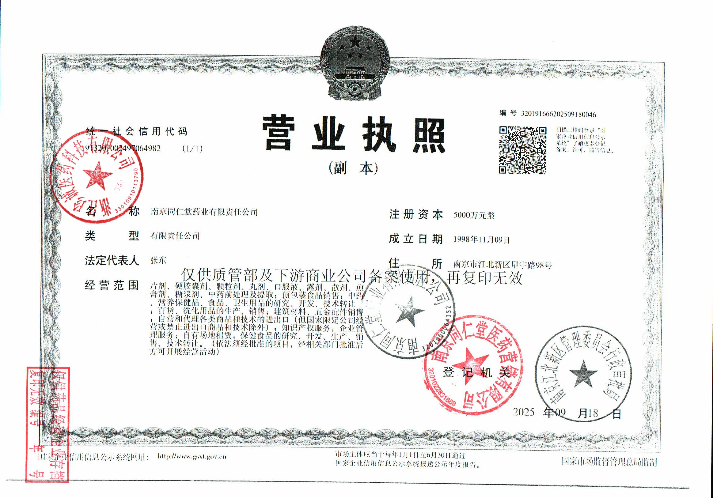 | 1 | Z99004208 | 南京同仁堂药业有限责任公司 | 许可证.jpg | Nov 11, 2025 2:41:54 PM | 查看下载 | |