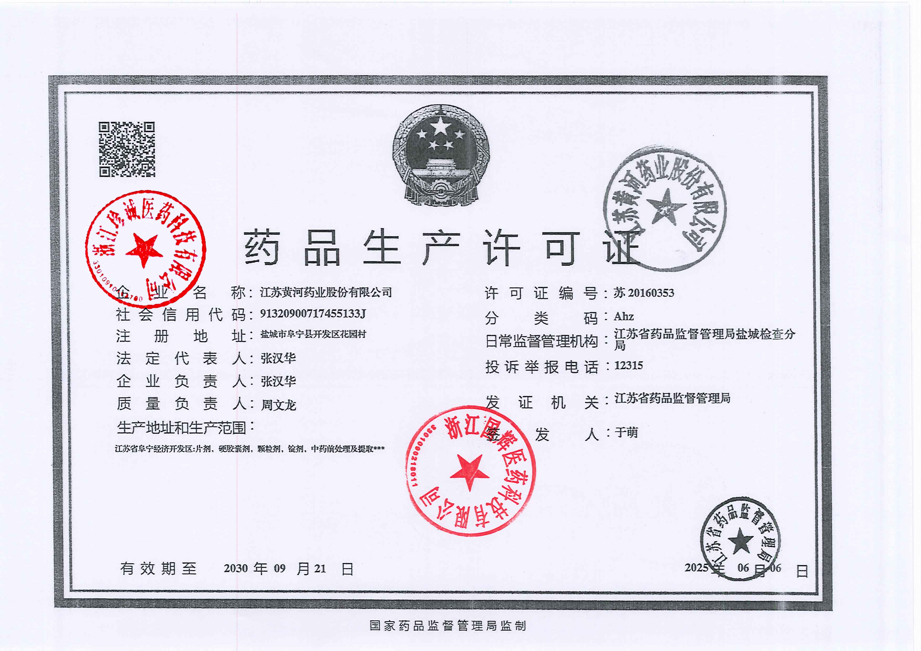 1 | Z99004236 | 江苏黄河药业股份有限公司 | 新药品生产许可证.jpg | Sep 22, 2025 1:49:16 PM | 查看下载 | |