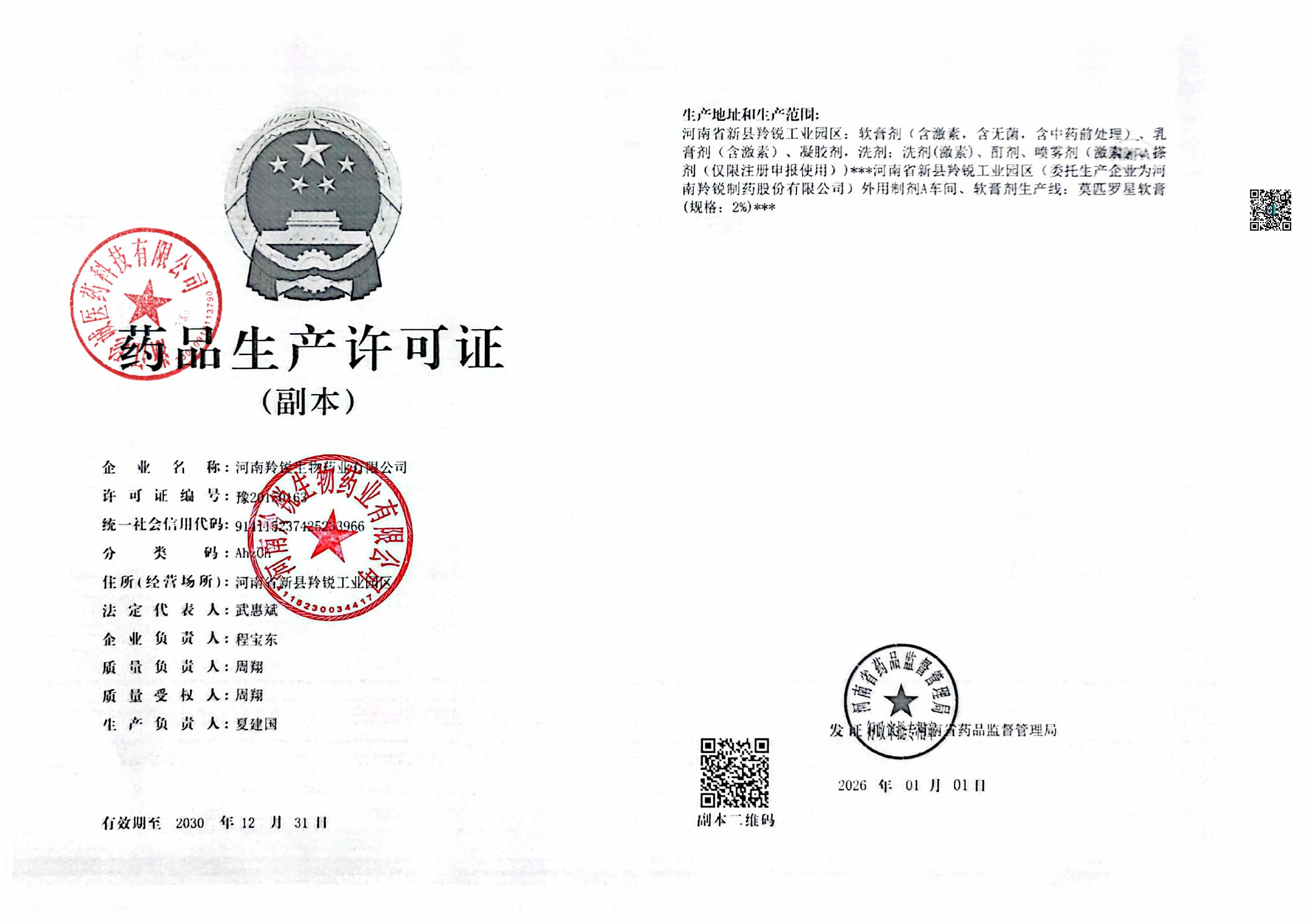 | 4 | Z99004242 | 河南羚锐生物药业有限公司 | 许可证.jpg | Jan 5, 2026 10:51:04 AM | 查看下载 | |