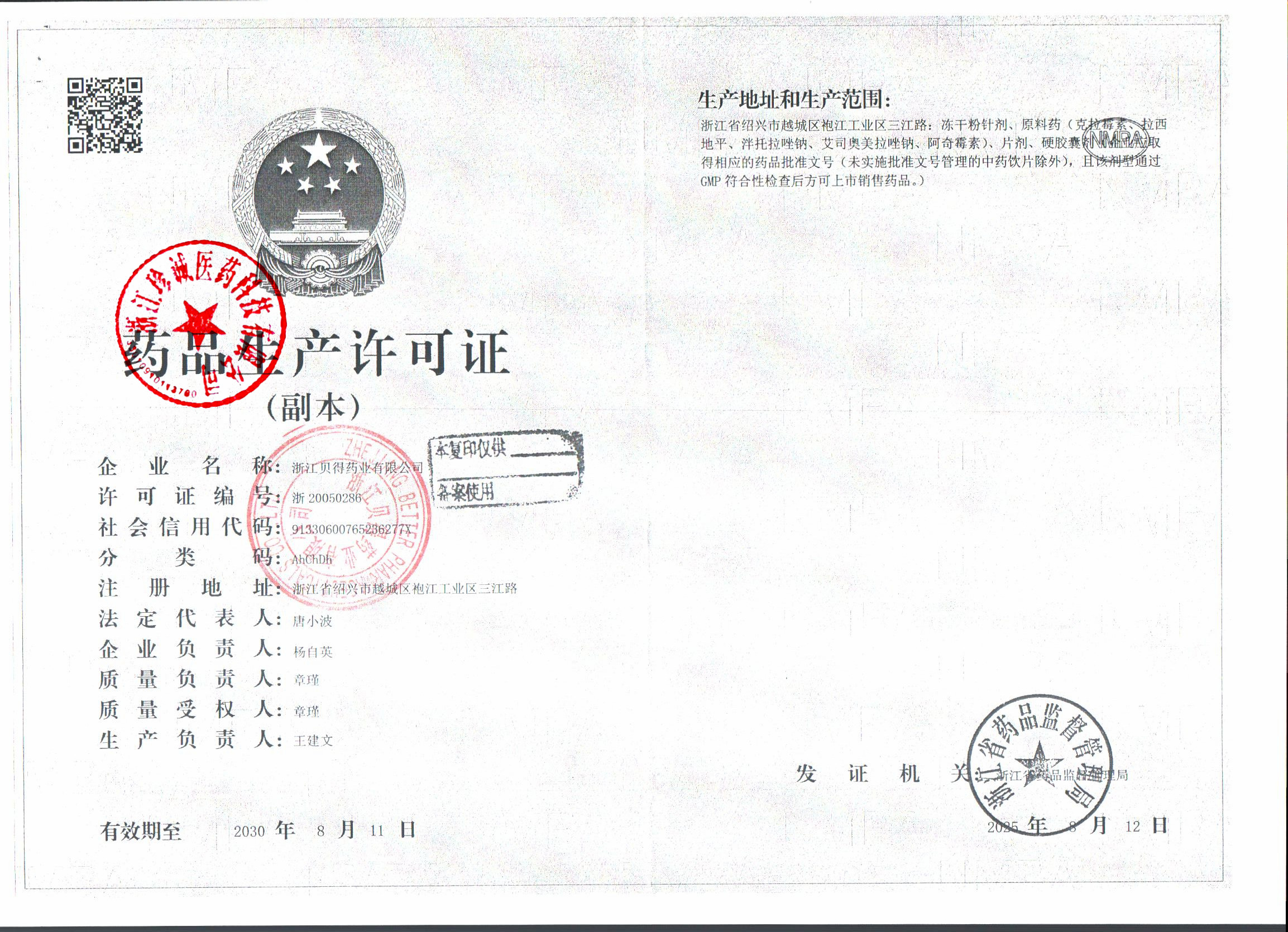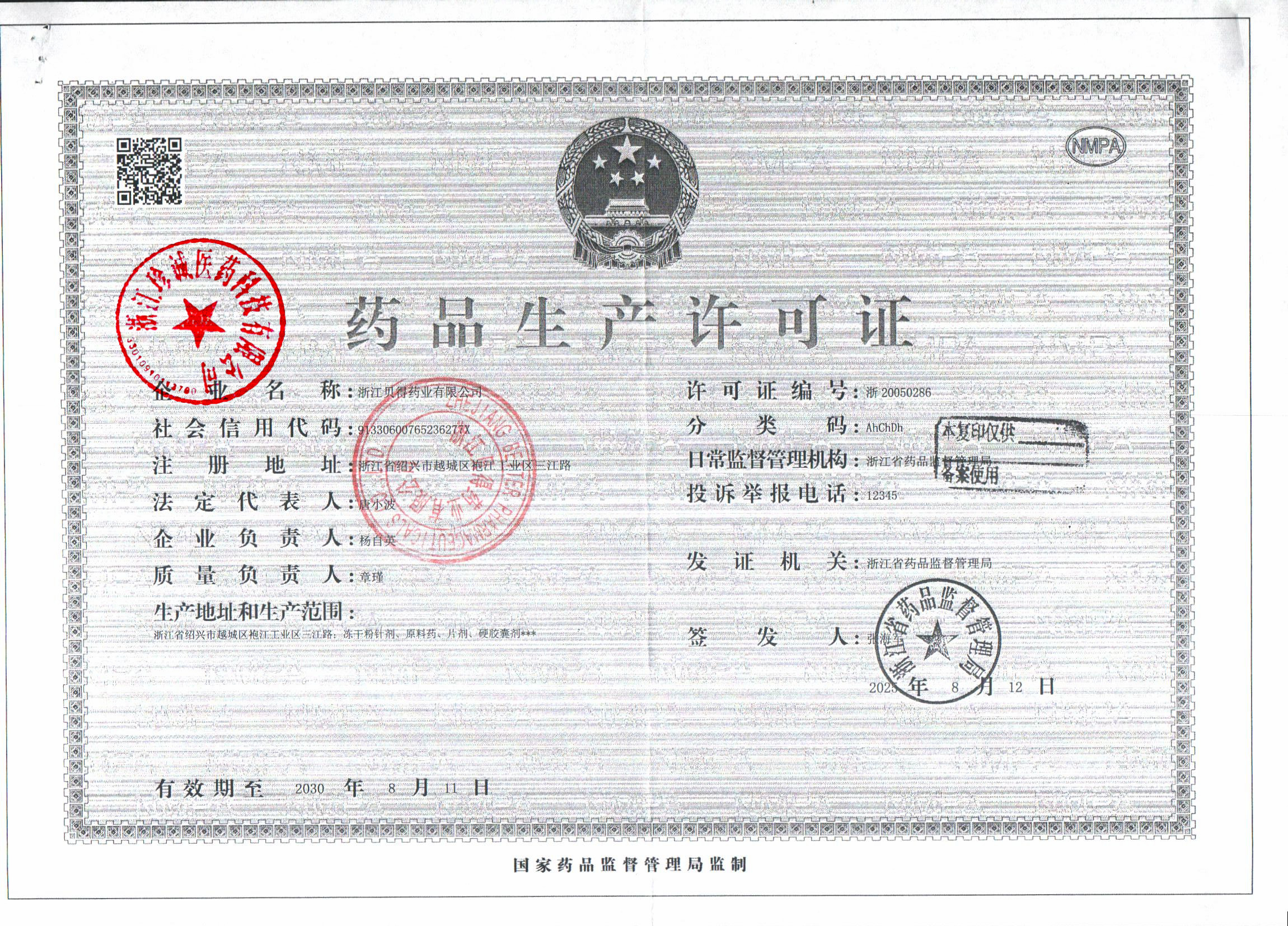 3 | Z99004278 | 浙江贝得药业有限公司 | 药品生产许可证 (1).jpg | Sep 26, 2025 3:16:45 PM | 查看下载 | |