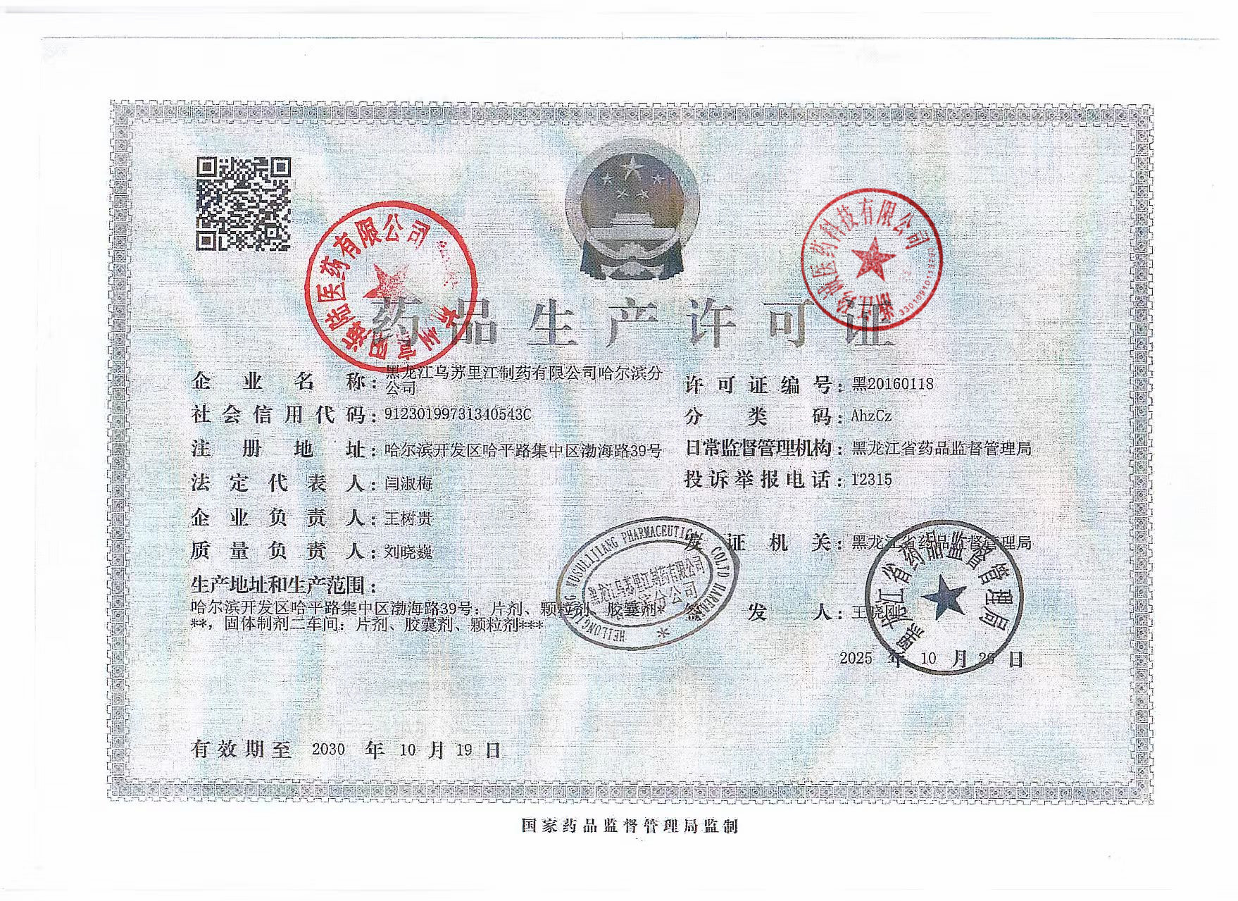 | 1 | Z99004504 | 黑龙江乌苏里江制药有限公司哈尔滨分公司 | 新许可证.jpg | Nov 14, 2025 10:47:27 AM | 查看下载 | |