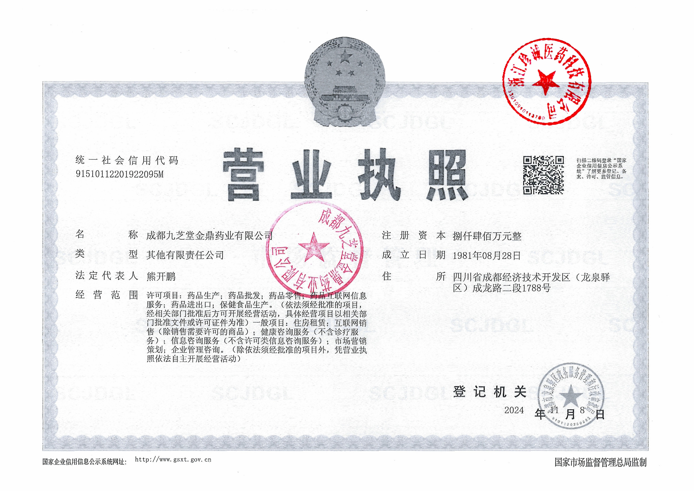 6 | Z99004518 | 成都九芝堂金鼎药业有限公司 | 营业执照 (1).jpg | Sep 15, 2025 4:15:20 PM | 查看下载 | |